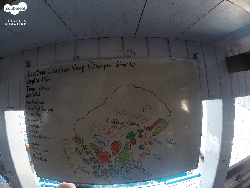 ●치킨 리프(Chicken Reef, Dampier Strait)살딘 리프와 케이프 크리 사이에 있는 곳으로 수심 25m에서 5m까지 슬로프가 형성되어 있다. 모래 슬로프에서 가든일을 볼 수 있으며, 배너피쉬와 푸질리어들이 무리지어 다닌다. 슬로프를 따라 산호뭉치들이 솟아 있으며 연산호, 부채산호들이 부착되어 있고, 다양한 열대 어류들을 구경할 수 있다. 다이빙을 마치고 얕은 수심에서 먹이 활동을 하는 작은 거북도 만날 수 있었다.