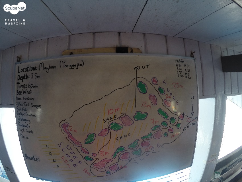 ●마이헴(Mayhem, Yanggefo)수심 16m에서 8m 정도까지 되는 리프이며 슬로프로 형성되어 조류를 타고 흘러가면서 다이빙을 즐기기에 좋다. 슬로프의 산호뭉치들 사이에서 물고기들과 해양생물들을 관찰하며 다이빙을 한다. 제비활치, 우베공 상어 여러 가지 마크로 생물들을 찾을 수 있다.