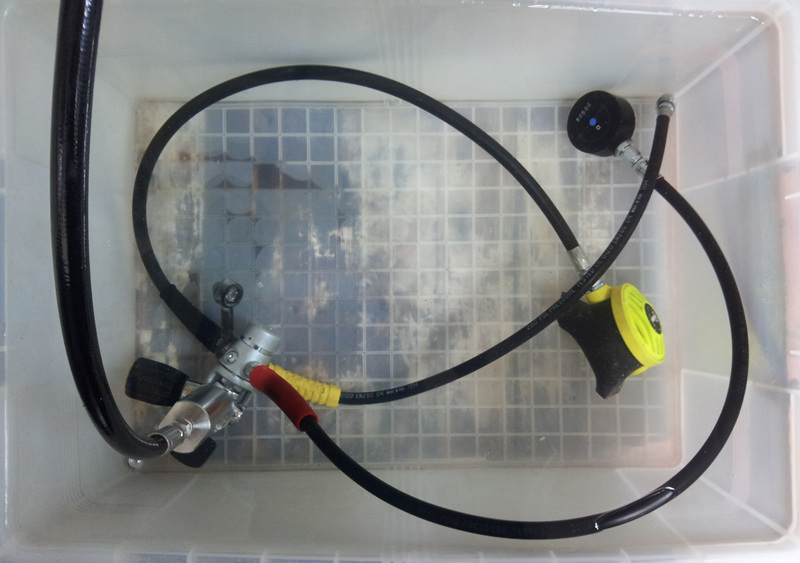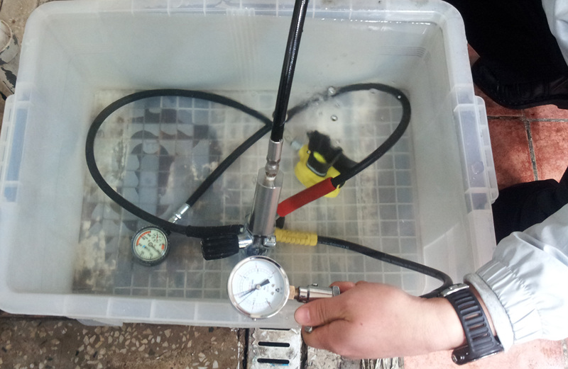 레귤레이터를 물에 담가, 기체가 새는 부위가 없는 지를 확인합니다. 이렇게 점검을 실시한 레귤레이터는 시리얼 넘버와 각종 증상 및 교환해야할 부품 등을 메모합니다.
