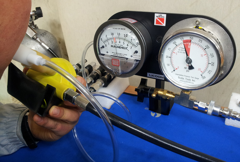 레귤레이터를 실린더에 장착하고, BC 호스에 중간압력 측정 게이지를 연결하여, 레귤레이터 1단계의 중간압력을 측정합니다. (1단계의 중간압력은 제조사와 종류에 따라 다르지만, 통상적으로 125~150 PSI(Pound/inch², 7.5 ~ 10.5kg/㎠) 사이입니다.