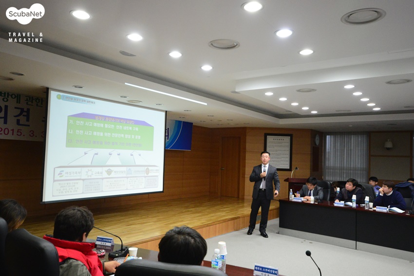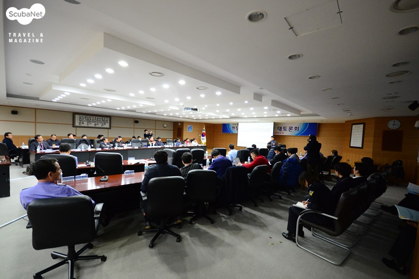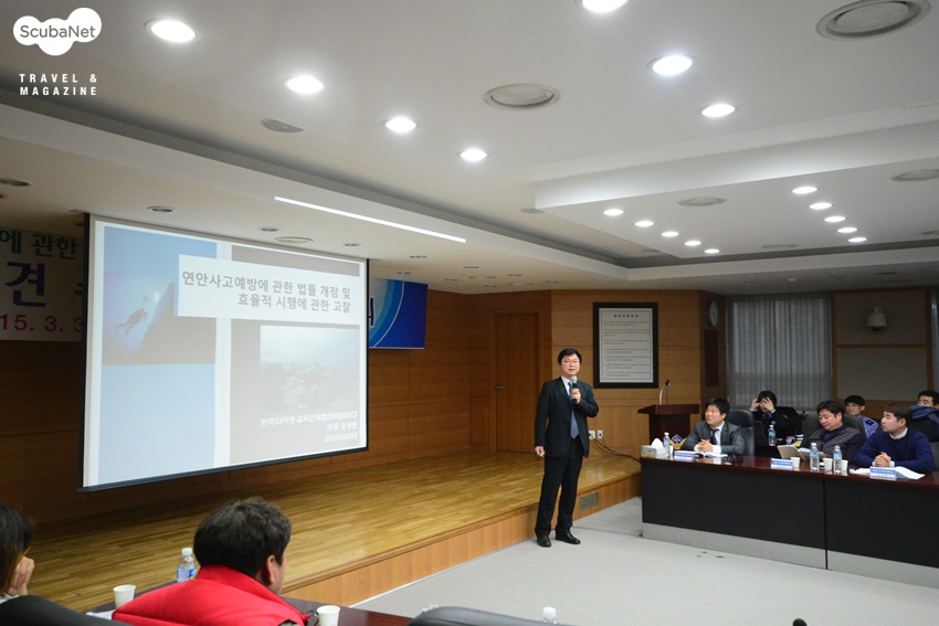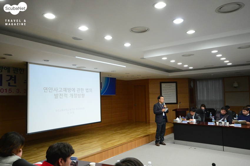 인천 송도의 해양경비안전본부에서 개최된 연안사고예방법 개정관련 토론회연안사고 예방에 대한 법률과 시행령, 시행규칙 개정을 위한 토론회해양경비안전본부(전 해경)의 해상안전과는 지난 3월 3일 인천 송도의 해경안전본부 2층 대회의실에서 ‘연안사고 예방에 관한 법령’ 개정 관련 현장의견 수렴을 위한 토론회를 개최했다. 이미 지방에서 공청회를 개최하며 다이빙업계의 반대 분위기를 감지했으며, 이번 토론회를 마지막으로 의견을 반영하여 개정(안)을 확정하고, 개정을 추진하겠다는 것이다. 하지만 스쿠버 다이빙 관련 조항의 완전 삭제를 요구하는 다이빙 업계의 주류 의견과는 달리 시행령이나 규칙의 일부만 개정하고 스쿠버 다이빙 관련 내용은 그대로 포함하고 가겠다는 의지를 보이고 있었다는 점에서 다이빙 업계에서는 크게 우려하고 있다.