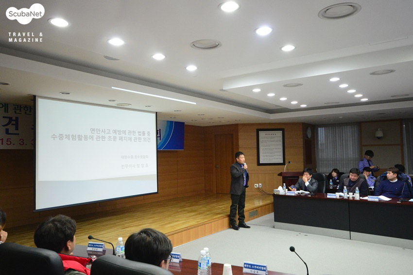 연안사고 예방에 관한 법률 개정 및 효율적 시행에 대해 한국다이빙교육단체협의회 의장으로서 수중체험활동에서 스쿠버 다이빙을 빼고, 입법 취지에 맞게 청소년들의 연안체험행사의 안전한 진행에 초점을 맞추라고 논리 정연하게 업계의 대표 의견을 발표한 홍성훈 한국잠수협회 사무국장이에 따르면 앞으로 야간다이빙 활동은 전면 금지되며, 대통령령에서는 1종공동어장과 양식장에서의 다이빙 활동을 금지하고 있다. 과연 우리나라 연안에서 1종공동어장과 양식장이 아닌 해변이 얼마나 있는가? 수중레저활동을 활성화하겠다는 법안이 오히려 스쿠버다이빙을 할 수 있는 곳을 모조리 없애고 있다.