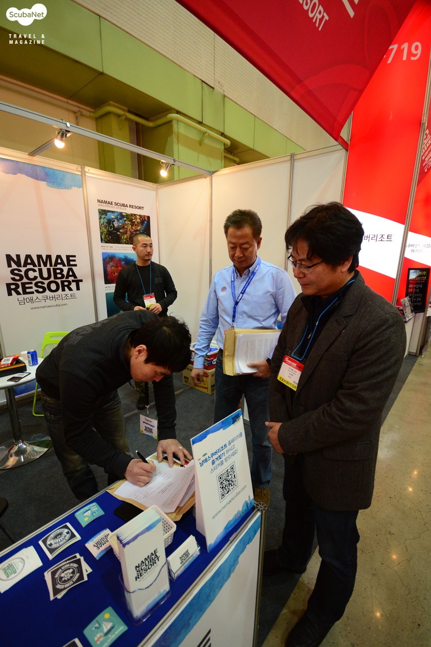 SPOEX 2015 현장에서 전시회 참가업체들을 대상으로 연안사고 예방법 반대 서명운동을 받고 있는 PADI 김부경 한국담당관과 마레스 코리아 우대혁 사장