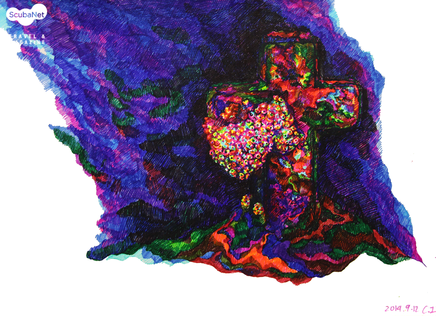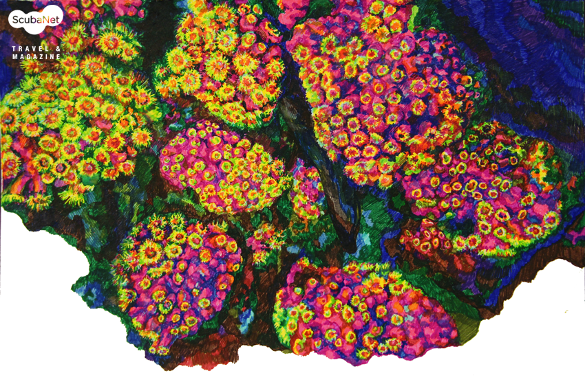 (Cathedral, Kirby's rock, Layag Layag, Vistamar)을 골랐다. 그리고 각 장소의 특징을 가장 잘 담은 수중풍경사진을 몇 장 선정해 이를 16가지 색상의 펜으로 재현하기 시작했다.