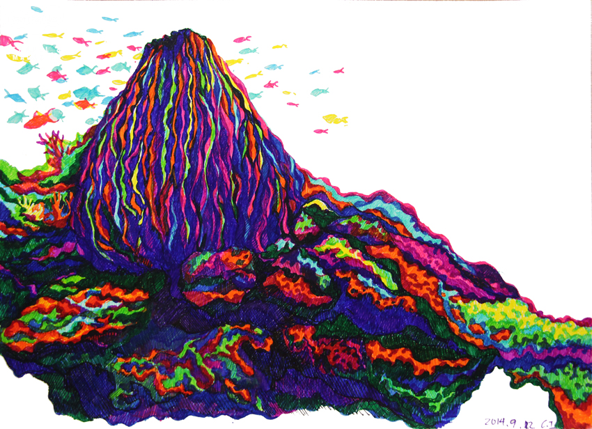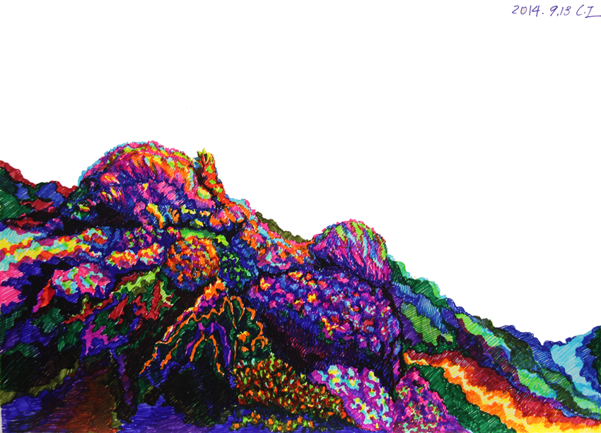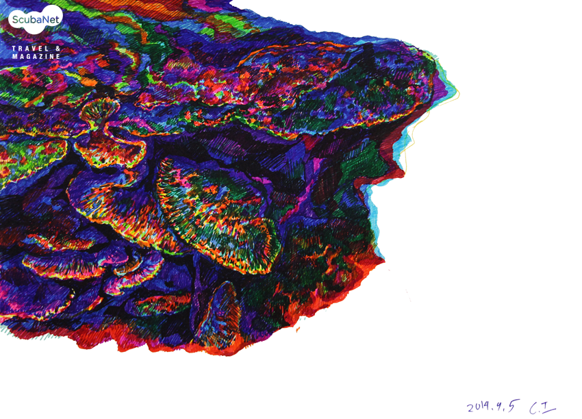처음에는 산호들의 수많은 색에 압도당해 작업을 어떻게 진행할지 갈피를 잡는데 시간이 좀 걸렸다. 하지만 산호의 형태와 색을 부분이 아닌 전체로 바라보게 되면서 그림을 그리기 더욱 수월해졌다. 수중지형들도 알고 보면 그 형태와 색에 나름의 규칙이 있고 그 지형을 묶는 공통적인 특징을 가지고 있다.