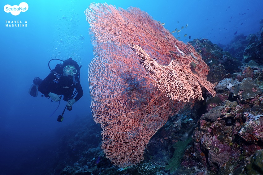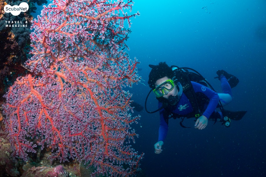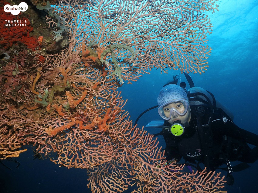 부채산호의 갈라진 사이에 버디를 위치시키고 물색의 변화를 위하여 상향앵글로 촬영한 사진. 모델: 이주현. Anilao, Philippines. Canon S100, Patima housing, Inon S2000 strobe, M mode, AWB, f6.3, 1/80s, ISO 400