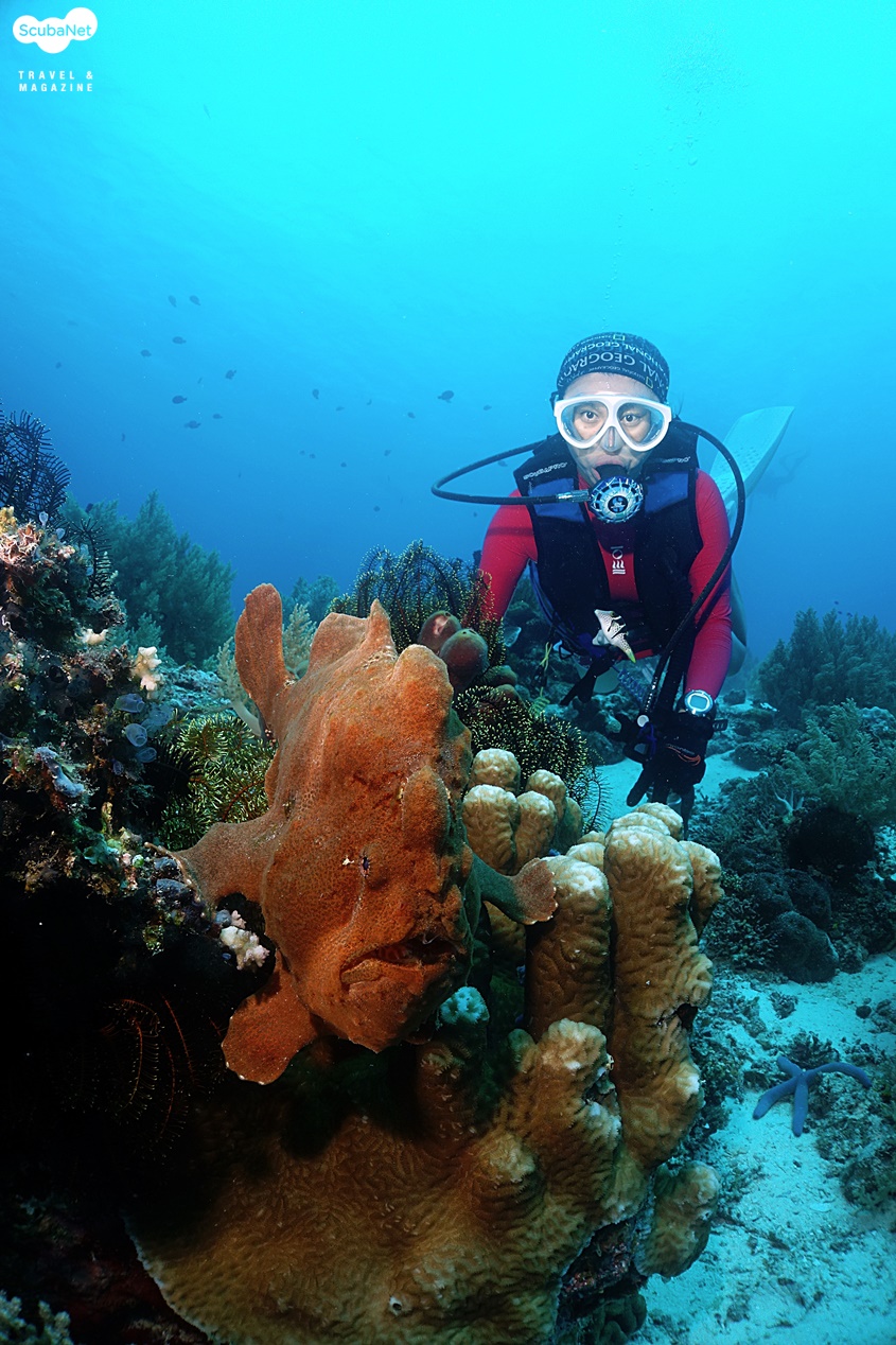 해면 위에 있는 커다란 씸뱅이와 함께 다이버를 촬영하였으며, 다이버의 시선이 씸뱅이를 바라보았으면 더 좋았을 것 같은 아쉬움이 남는다. 모델이 정면을 바라보고 있어 약간 측면에 위치한 스트로브의 빛이 마스크 안까지 잘 들어갔다. 모델: 마야 한. Balicasac, Philippines. Sony RX100, Patima housing, Inon wide conversion lens, Sea&Sea YS-D1 x2, M mode, AWB, f8, 1/125s, ISO 200