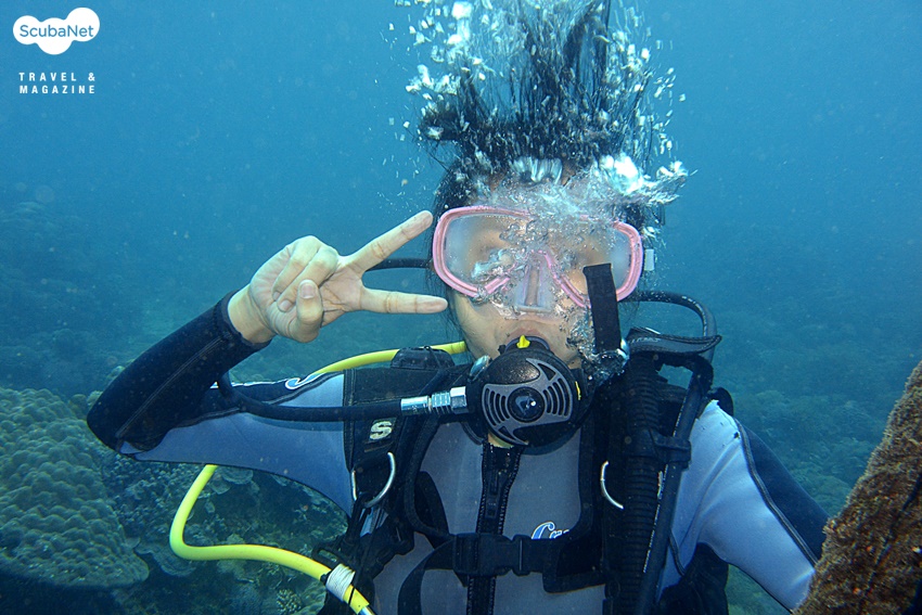 첫 오픈워터 실습 다이빙 중 커스텀 화이트밸런스로 자연광을 이용하여 스냅으로 촬영한 사진. 촬영: 지상혁, 모델: 강혜수. Balicasac, Philippines. Sony RX100, Patima housing, Inon wide conversion lens, M mode, Custom WB, f5, 1/640s, ISO 400