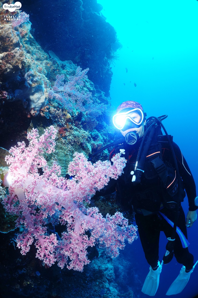 기왕이면 수중이라는 표현이 잘 되는 산호나 물고기, 거북이 등의 피사체와 함께 모델의 기념사진을 찍어주는 것이 좋겠지요. 그러나 초보자의 기념사진을 촬영해줘야 한다면 모델을 내 마음대로 위치시킬 수가 없습니다. 게다가 커다란 산호 가까이 불렀다가 큰 화를 불러올 수도 있습니다. 모델이 쉽게 접근할 수 있고 어렵지않게 자세를 잡을 수 있는 적당한 피사체를 선택하여야 합니다.