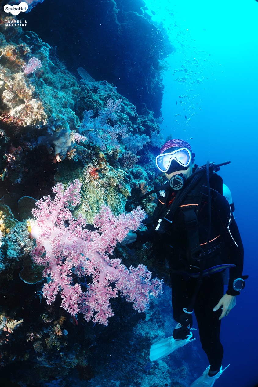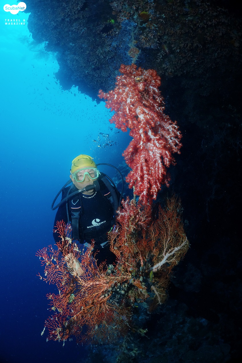 절벽의 오버행에 달려있는 로프에 활짝 피어난 산호와 함께 다이버를 촬영하였다. 모델: 이성희. Balicasac, Philippines. Sony RX100, Patima housing, Sea&Sea YS-D1 strobe x2, Inon wide conversion lens, M mode, AWB, f8, 1/125s, ISO 400