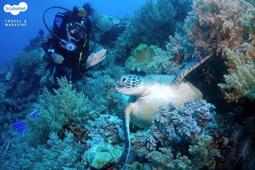산호초에서 쉬고 있는 바다거북이를 앞에 두고 초보다이버의 기념사진을 촬영하였다. 먼저 앵글을 잡고 다이버를 다가오게 하면서 여러 장 촬영하였다. Balicasac, Philippines. Sony RX100, Patima housing, Sea&Sea YS-D1 strobe x2, Inon wide conversion lens, M mode, AWB, f8, 1/60s, ISO 100 1