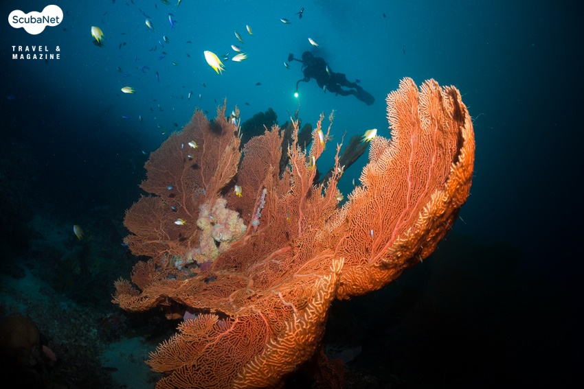 급경사의 슬로프에 있는 부채산호를 촬영하면서 다이버를 멀리에 두고 실루엣으로 처리하였다. 모델: 서민욱. Doljo beach, Philippines. Sony RX100, Patima housing, Inon S2000 strobe, Inon wide conversion lens, M mode, AWB, f6.3, 1/125s, ISO 200