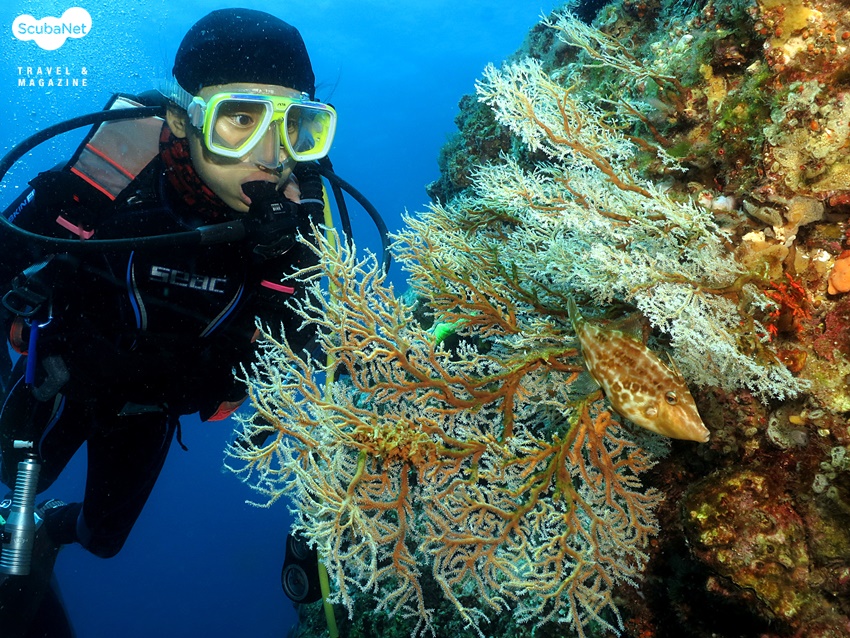 절벽에 서식하는 산호에 숨어있는 쥐치를 관찰하는 다이버를 촬영하였다. 쥐치를 바라보는 다이버의 시선이 자연스럽게 표현되었다. 울릉도 죽도1번 포인트. 모델:김가람. Canon S100, Patima housing, Inon S2000 strobe, M mode, AWB, f8, 1/125s, ISO 200