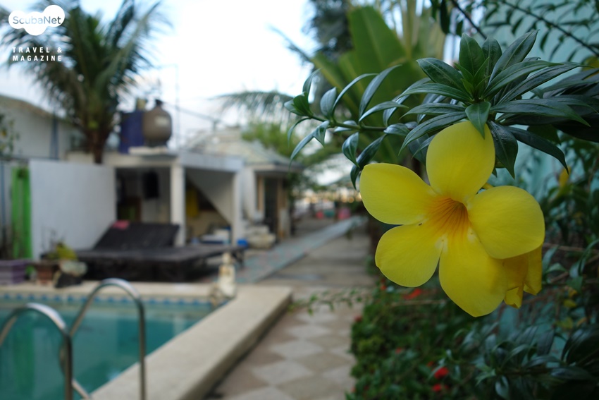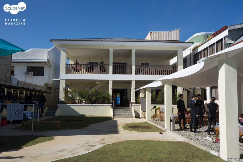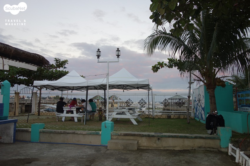 넓은 정원에는 잔디가 깔려있고 다이빙을 준비하고 브리핑을 하는 곳에는 천막이 있어 햇볕을 가려준다