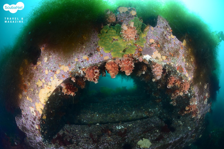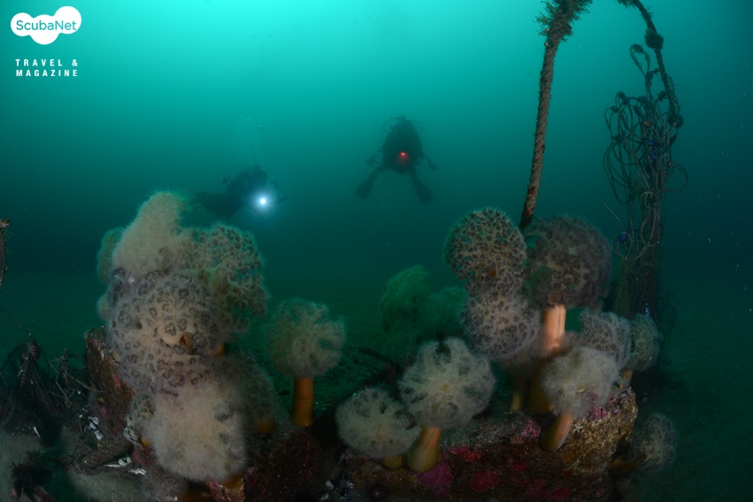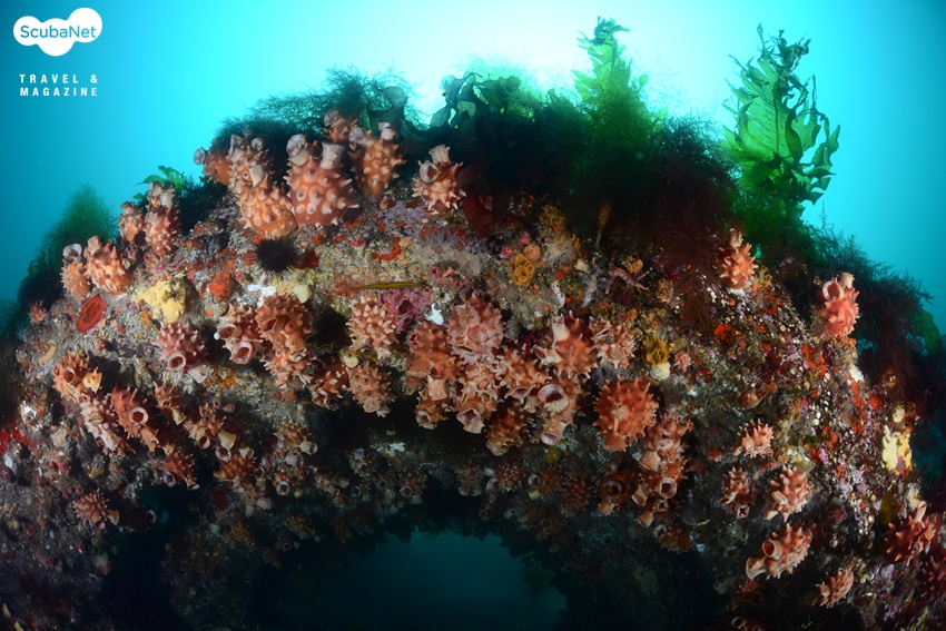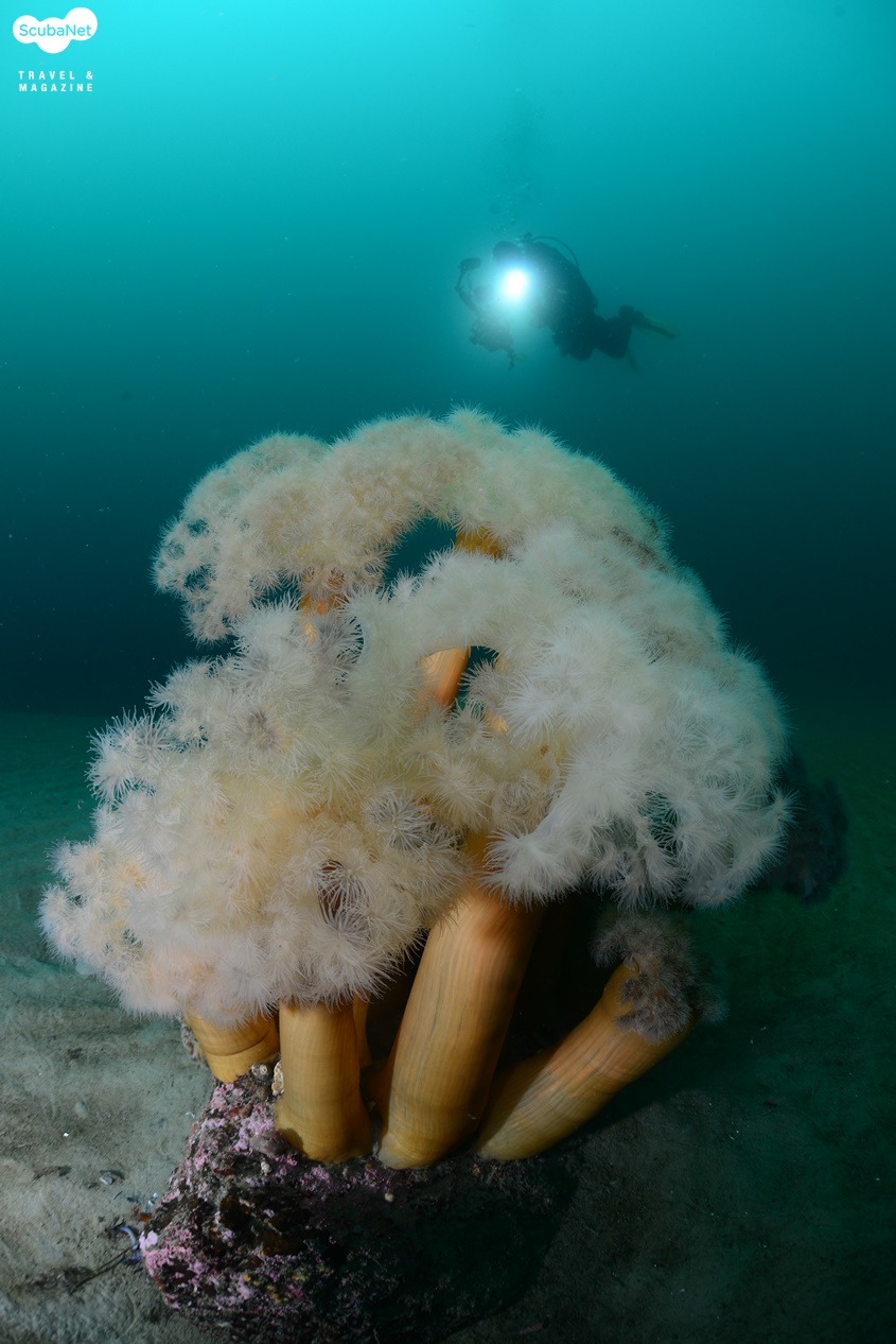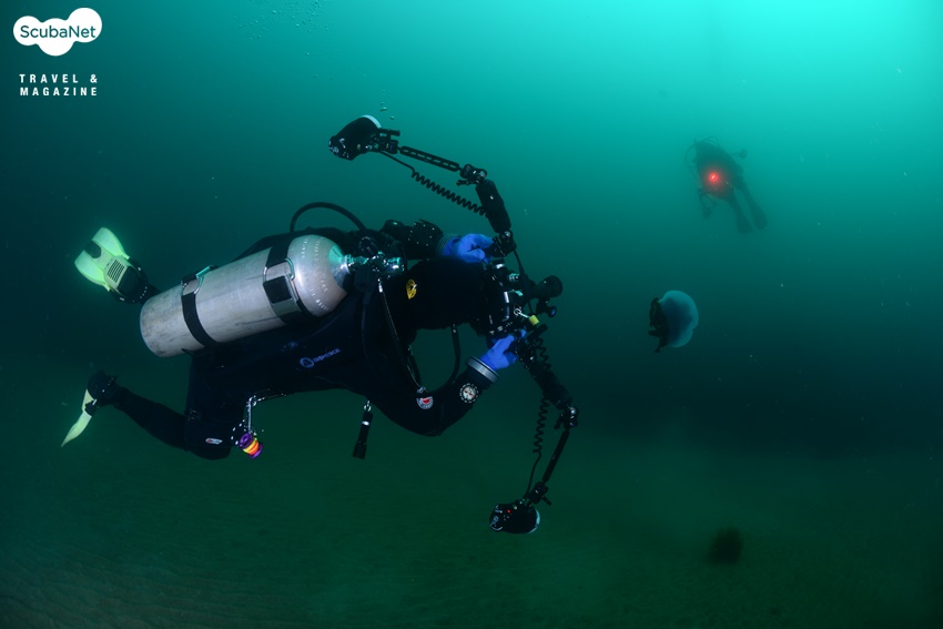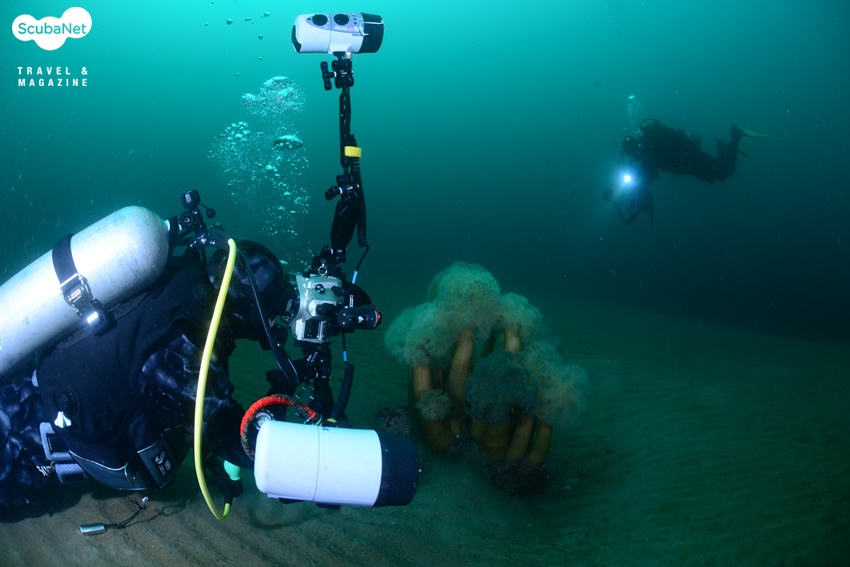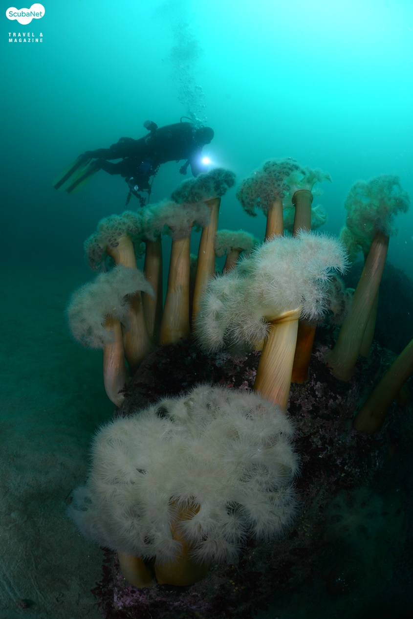 낮은 수온에서만 활짝 꽃피우는 세날말미잘 군락하강라인을 따라서 내려가니 노출된 입 주위에서 잠깐 한기가 느껴졌다가 이내 익숙해졌다. 어초를 돌아 암반을 찾아 나가다가 모래 밭에서 보름달물해파리를 만나 촬영하는 다이버들의 모습을 기록하고, 다시 이동하니 작은 바위에 폐로프와 섬유세닐말미잘들이 붙어 있는 것이 보였다. 보기 좋은 모습은 아니지만 바다 속의 모습을 있는 그대로 기록한다는 생각으로 한 컷을 담고 다시 이동하니 그리 커진 않지만 암반이 나타나고 그 위를 섬유세닐말미잘들이 뒤덮고 있는 모습이 보였다. 함께 다이빙한 동료 사진가들을 모델로 몇 컷을 촬영하니 김학주 원장이 먼저 상승 신호를 보내왔다. 함께 어초로 돌아와 하강라인 근처에서 이종순 씨를 기다리며 어초 사진을 촬영하고 있었다.