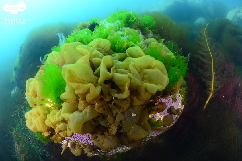 수중촬영에 열중하고 있는 김학주 원장님모자반 포인트에서 동남쪽으로 진행하면 12m 수심에서 모래와 암반이 교차되는데 그곳에 반구형 어초와 사다리꼴 어초들이 있다. 그 끝의 어초에서 대왕문어를 보았다며 이기영 대표가 그곳으로 안내하기로 했다. 조도의 얕은 수심은 미역, 모자반, 구멍쇠미역, 다시마 등 대형 갈조류들과 파래 등 해조류들이 번성하고 있었다. 한참을 진행하여 이기영 대표가 문어를 보았던 곳이라는 신호를 보내자 다이버들이 근처의 어초 사이를 뒤지기 시작했다. 반구형 어초 옆과 속에는 붉은 색 멍게들이 빽빽하게 붙어 있었고, 위쪽으로는 미역 등의 해조류들이 자라고 있었다. 어초들이 성공적으로 정착했다는 느낌이 들 정도여서 그 모습을 이리저리 촬영했다. 하지만 아무리 돌아다녀도 대왕문어는 보이지 않았다. 역시 살아있는 해양생물은 그때그때 돌아다니기 때문에 매번 같은 자리에 있을 것으로 기대하는 것은 무리가 있다. 운이 있어야 만나는 것이지!