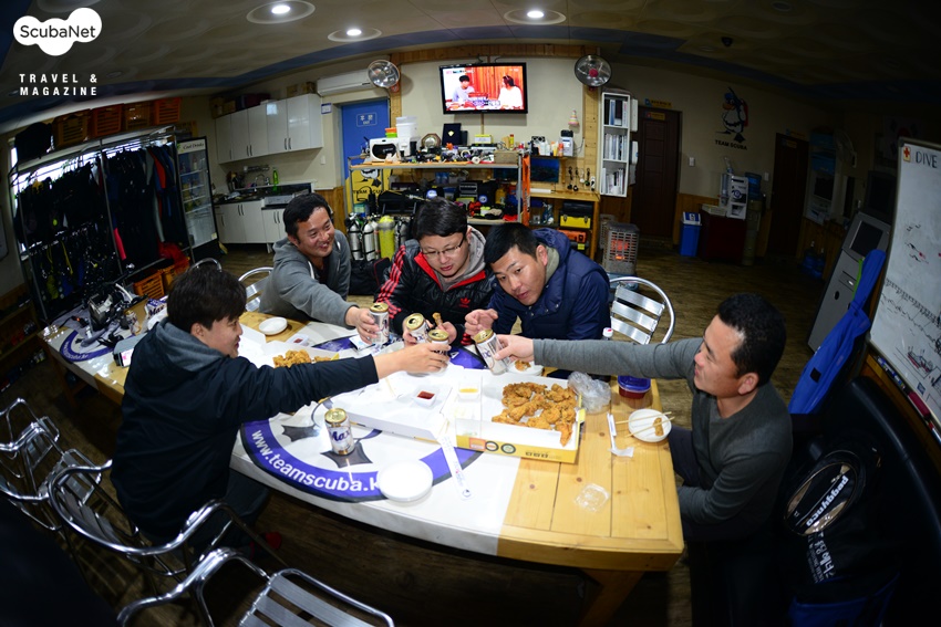 다이빙을 마치고 장비를 정리해서 널어 놓고 물기가 빠지길 기다리면서 간단히 치킨을 시켜서 맥주를 딱 한 캔씩만 했다. 다들 운전을 해서 돌아가야 하는 상황이지만 귀경하는 고속도로가 많이 막히는 시간이라 차라리 좀 쉬었다가 늦게 출발하는 것이 나을 것 같다는 의견이었다. 촬영한 사진들을 보고, 문어를 다시 만나지 못한 아쉬움도 이야기하면서 다이버들의 대화는 끝이 없었다. 어느덧 땅거미가 내리는 어둑한 저녁이 되어서야 물기가 얼추 빠진 장비를 챙겨서 다음에 다시 볼 것을 기약하며 주인장들만 남기고 하나 둘 리조트를 떠났다.