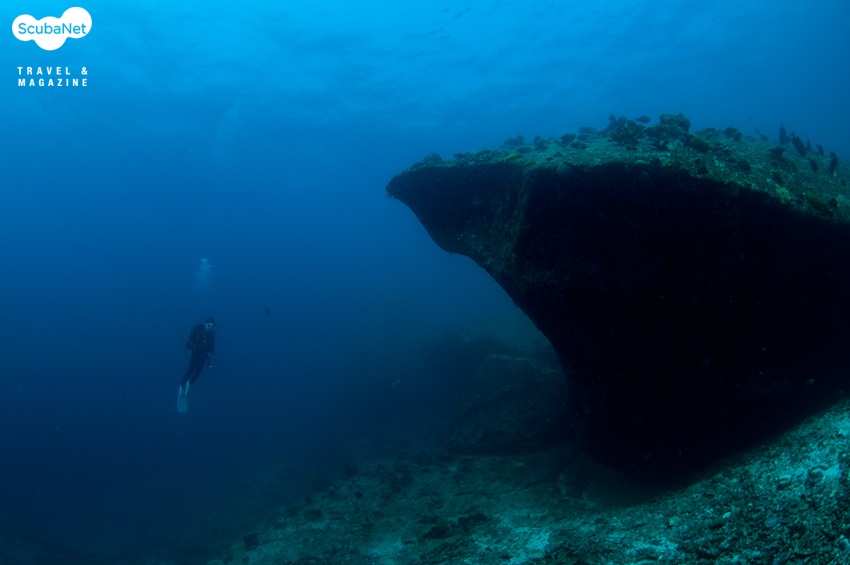 이렇게 화려한 작은 바위들을 지나다 보면 이내 커다란 바위산이 나타나고 이제는 화려함이 아니라 지형의 웅장함에 넋을 잃게 된다. 별다른 부착물이 없어 무채색으로 보이는 바위는 거칠고 거대한 매력이 있었다. 한 포인트 안에 여성적인 매력과 남성적인 매력이 함께 있는 것이 마치 태초의 에덴 동산에 아담과 하와가 함께 있던 것 같다는 생각을 하며 멋진 다이빙을 마쳤다.