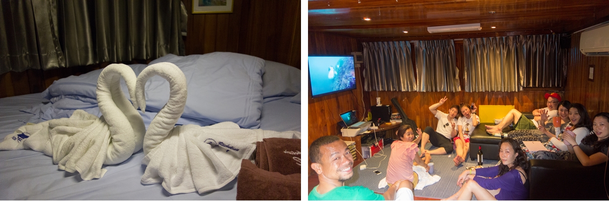 메인 데크의 드라이 존 dry zone에는 7개의 선실이 있고 배 후미는 웻 존wet zone으로 다이빙을 준비하는 곳이다. 충전 시설과 탱크, 장비가 빼곡히 놓여 있다. 웻 존과 드라이 존인 중간에 카메라 세팅을 할 수 있는 긴 테이블과 그 위로 작은 선반이 길게 있다. 선반은 방 별로 작은 소지품을 넣을 수 있게 나뉘어 있어 모두에게 요긴하게 쓰였다.
