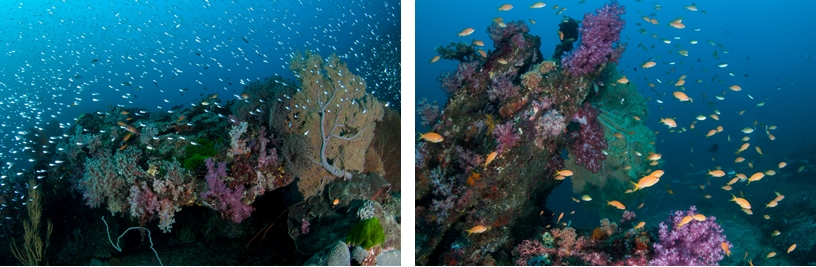 리쉘리우 락 Richeliu Rock사실 만타나 고래상어를 보는 것보다 더욱 기대했던 포인트이다. 리쉘리우 락이 고래상어가 자주 나오고, 말발굽 모양으로 생겼다고 해서 "고래상어를 부르는 자석"이라는 별명이 있다는데 그런 것보다 사진으로 보았던 리쉘리우 락의 건강한 산호와 많은 물고기들이 만드는 아름다운 풍경을 더 기대했다. 리쉘리우 락의 산호는 기대보다 더욱 화려했고 물고기는 기대 이상으로 수와 종류가 많았다. 할리퀸 쉬림프, 해마 등 작은 생물들도 많이 만날 수 있었다.