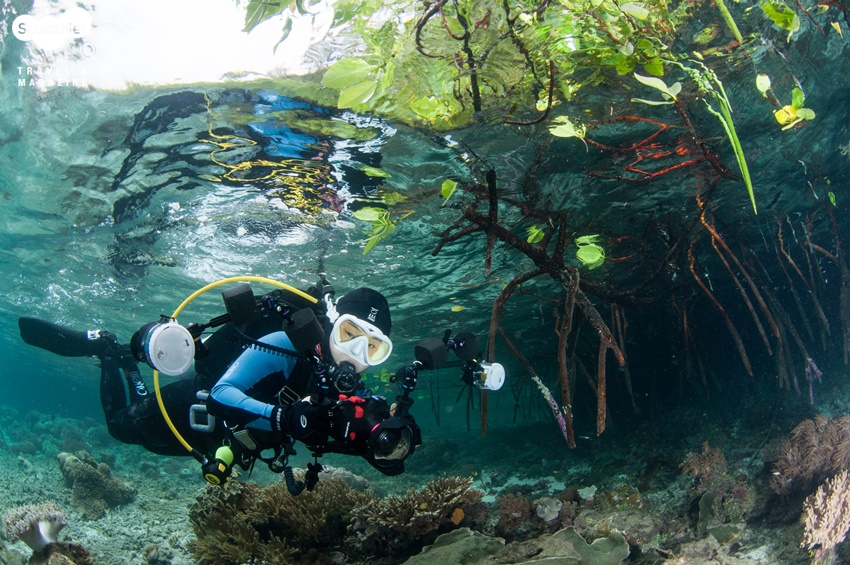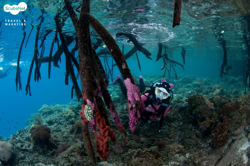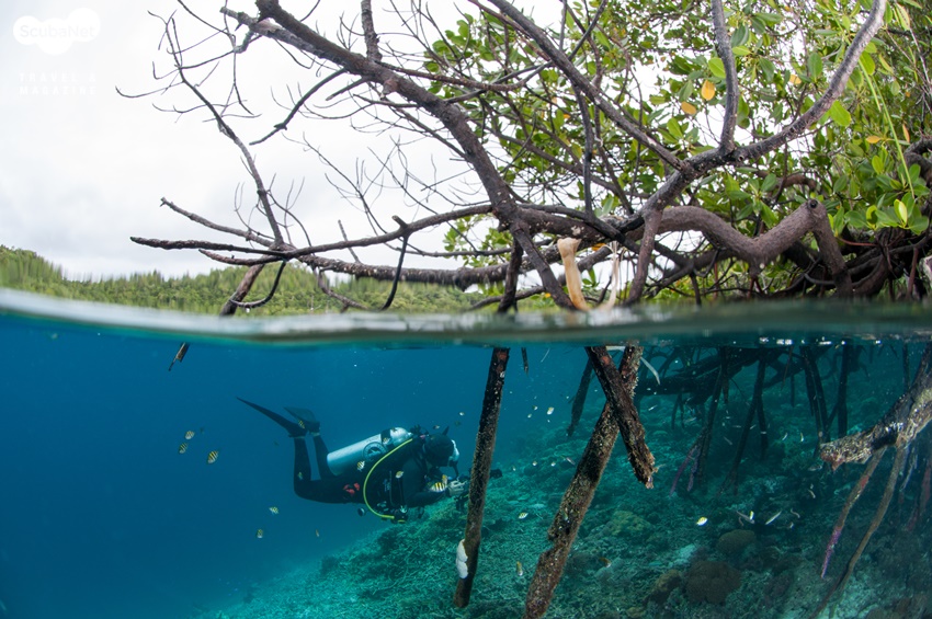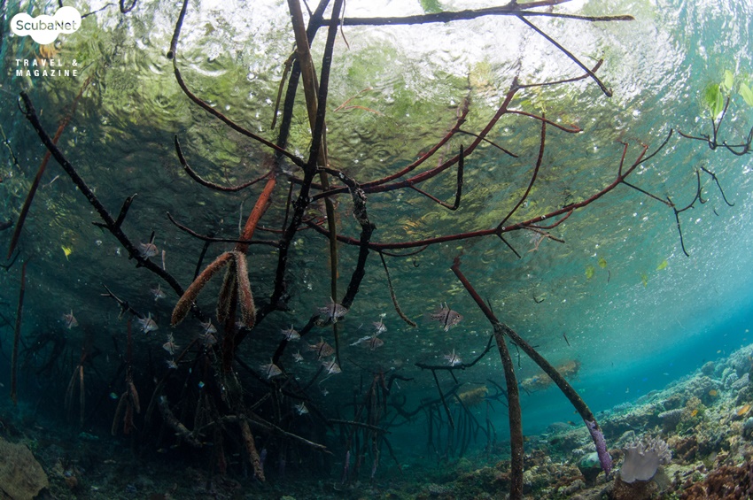 양겔로 릿지 Yangelo Ridge 즐거운 뱃놀이 후 날씨는 점점 더 흐려져 다이빙 포인트에 도착했을 때는 온 하늘이 하얀 구름으로 덮여있었다. 맹그로브 숲이 있는 얕은 곳에서 다이빙을 하다가 뿔산호가 가득한 슬로프를 따라 내려가기로 했다. 물속에는 가느다란 나무 뿌리가 아치 모양으로 뻗어 있었다.