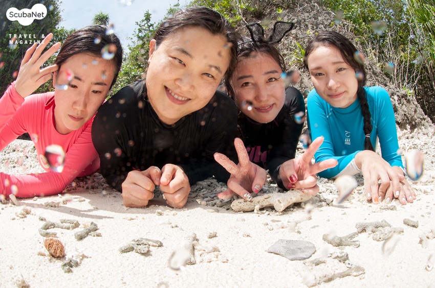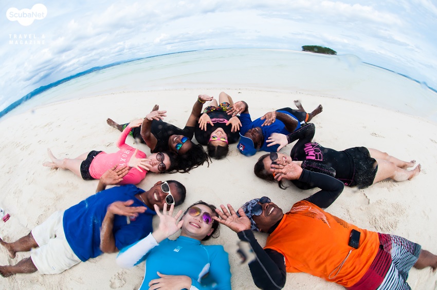 1. 산호 가득 아름다운 바다를 맨 몸으로 즐기자, 아름다운 해변의 스노클링 오전 다이빙 2번을 마친 후였다. 세 개의 섬이 귀엽게 모여있는 것이 보였다. 라자암팟 대부분의 작은 섬들이 나무로 가득 둘러있는 것과 달리 작은 해변이 있는 섬이었다. 오늘 오후의 놀 곳은 바로 저기다! 해변에서 놀고 얕은 곳에서 스노클링을 하기로 했다. 스노클과 핀, 마스크, 카메라만 챙겨 스피드 보트에 몸을 실었다. 각종 산호와 작은 물고기가 가득한 생명력 넘치는 바다에 한 명 한 명 맨 몸으로 뛰어 들었고 그 모습은 그대로 한 폭의 그림 같았다.