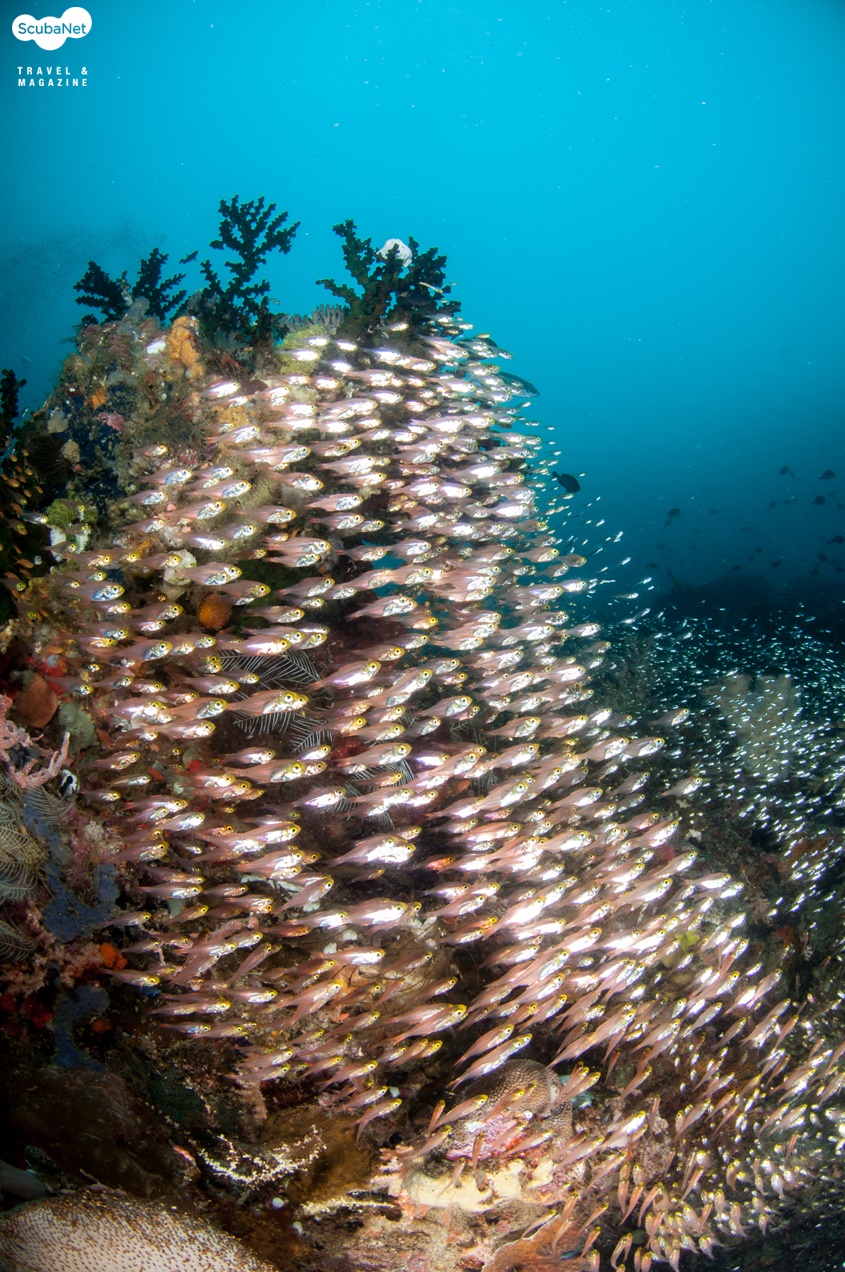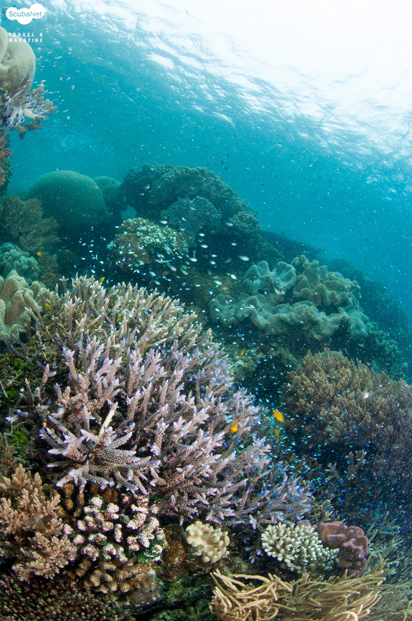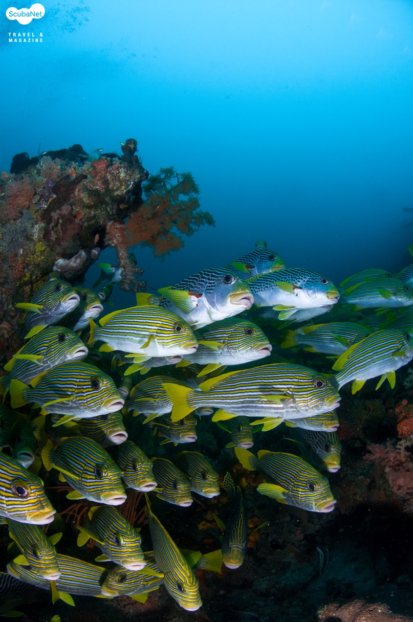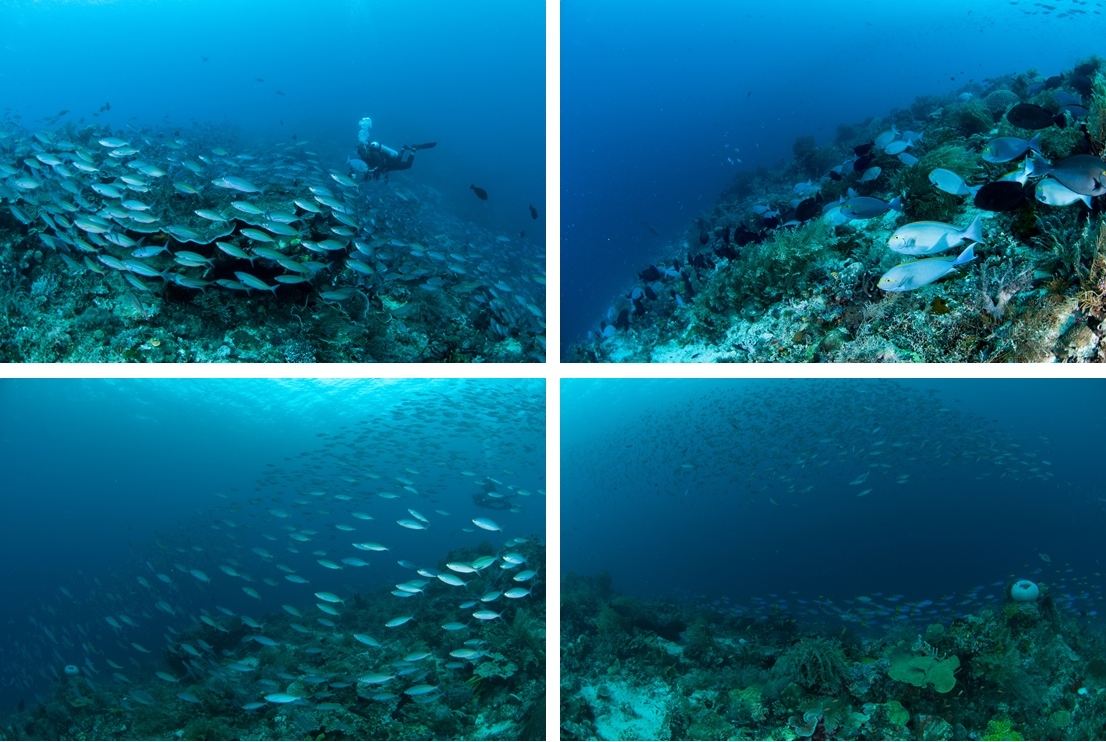 지금까지 다이빙을 하면서 본 모든 스위트립스를 합쳐놓은 것보다 더 많은 수의 스위트립스가 있었다. 수 백 마리는 될 듯 했고 사진에 다 담을 수 없을 정도의 숫자였다. 한 마리 한 마리의 스위트립스도 예쁘지만 그것들이 모여있으니 더욱 멋진 장관이었다. 이어 얕은 곳으로 올라가니 아름다운 산호 정원이 펼쳐졌다.