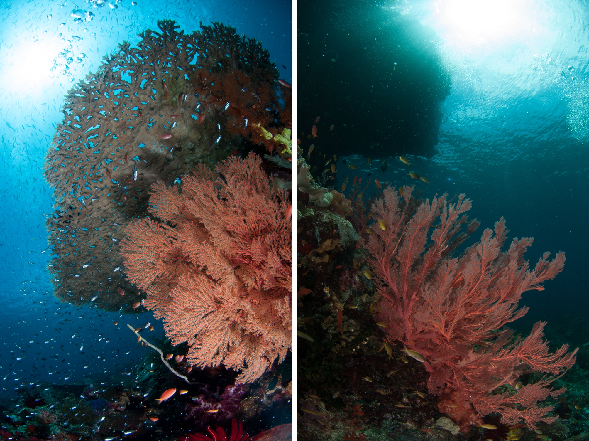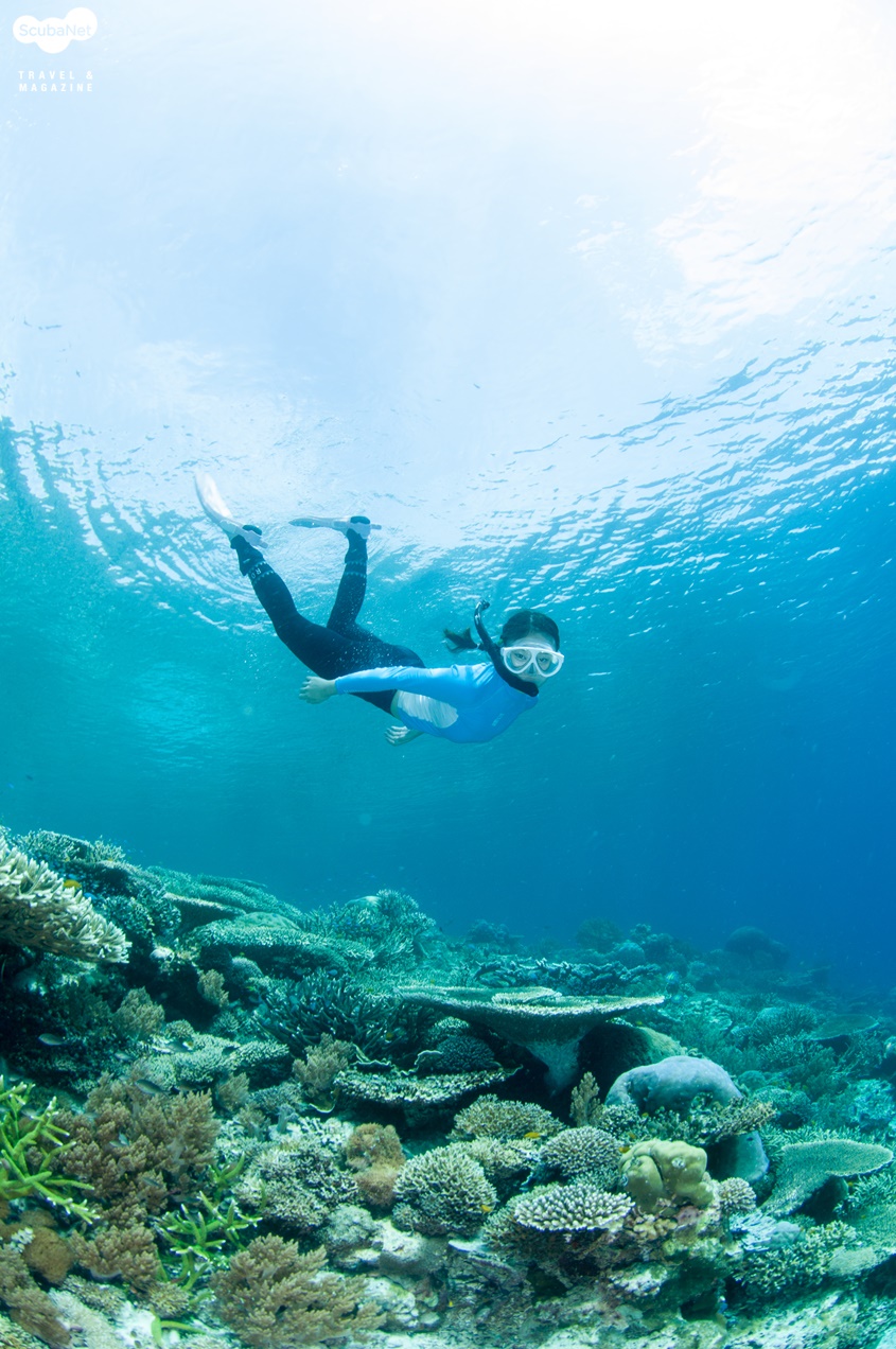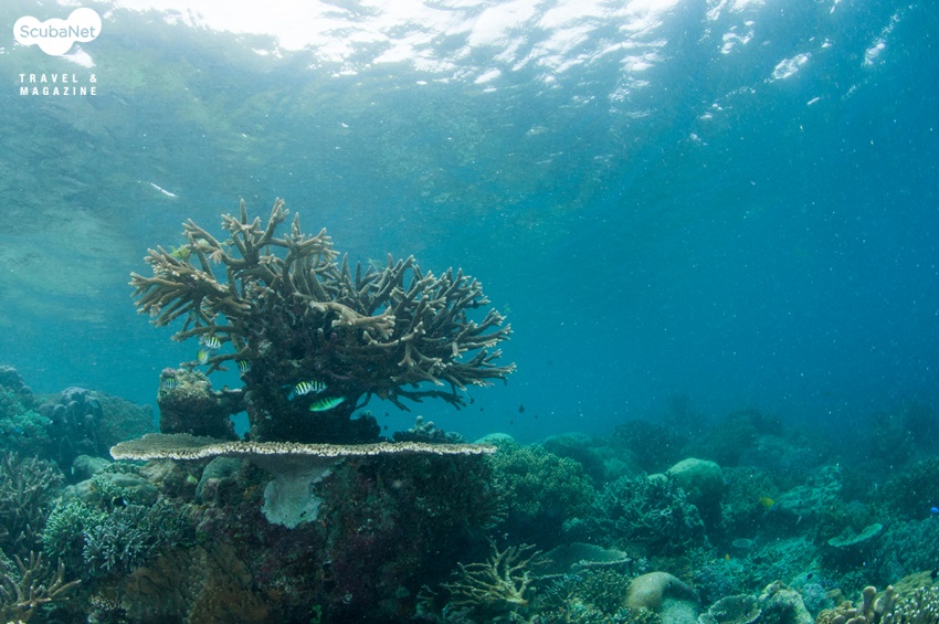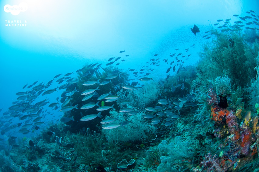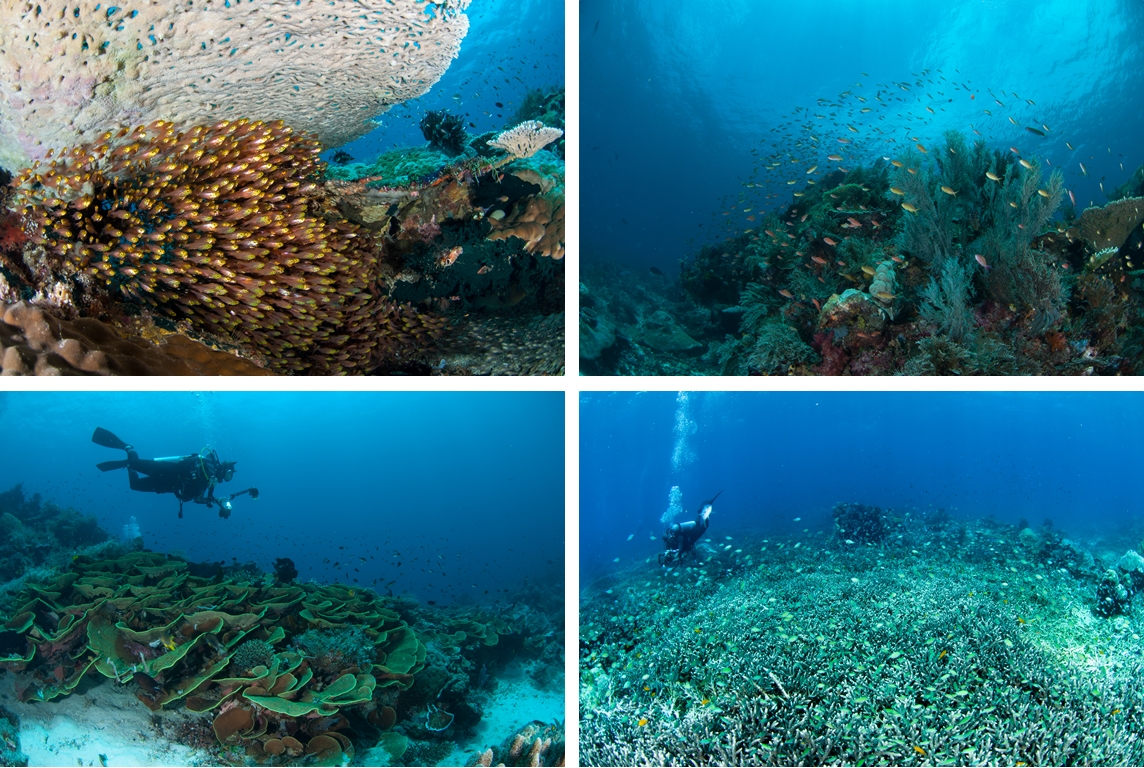 지금까지 다이빙을 하면서 본 모든 스위트립스를 합쳐놓은 것보다 더 많은 수의 스위트립스가 있었다. 수 백 마리는 될 듯 했고 사진에 다 담을 수 없을 정도의 숫자였다. 한 마리 한 마리의 스위트립스도 예쁘지만 그것들이 모여있으니 더욱 멋진 장관이었다. 이어 얕은 곳으로 올라가니 아름다운 산호 정원이 펼쳐졌다.