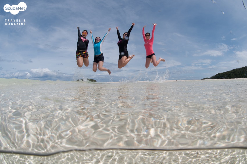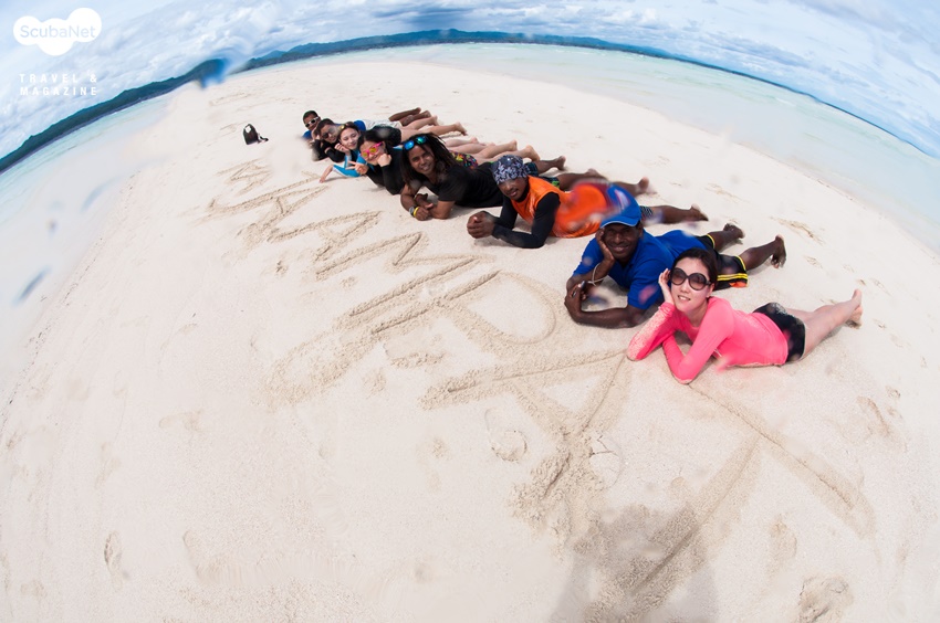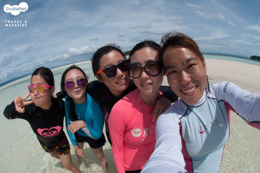 Kris와 Tedy는 우리를 얕은 모래톱으로 데리고 갔다. 다른 스태프들도 함께 했다. 하얀 모래톱과 좌우로 펼쳐진 투명하고 파란 바다, 그 위에 군데군데 떠있는 초록 섬.