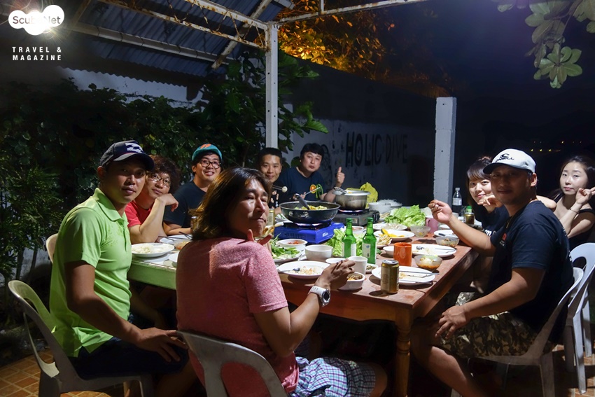 1층 밖으로 나가면 넓은 정원이다. 정원에도 커다란 식탁이 있어 다이빙 후 젖은 슈트를 입고 있는 점심이나 바닷가 야외의 낭만 있는 식사를 하고 싶은 저녁에는 정원에서 식사를 할 수 있다. 낮에는 파란 하늘과 시원한 바다, 저녁에는 멋진 노을, 밤에는 반짝이는 별들이 쏟아지는 정원은 아기자기 귀엽게 꾸며진 홀릭 다이브에서도 가장 멋진 공간이다.