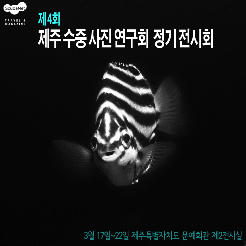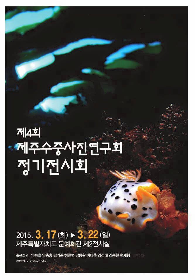 제주수중사진연구회(회장 양승철)는 지난 3월 17일~22일 제주특별자치도 문예회관 제2전시실에서 제4회 정기전시회를 개최했다. 전시회에는 양승철 회장과 양충홍 부회장을 비롯해서 김기준, 허천범, 강동완, 이태훈, 김건래, 김동한, 현재형 회원들이 출품하였다. 3월 17일 오후 6시에 오픈식을 가졌으며 제주도의 수중사진작가들과 육상사진작가들이 참가하여 전시회를 축하해주었다. 여기에 전시회의 분위기와 회원들의 전시작들을 소개하도록 하겠다.