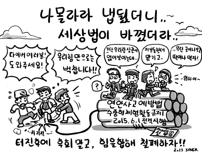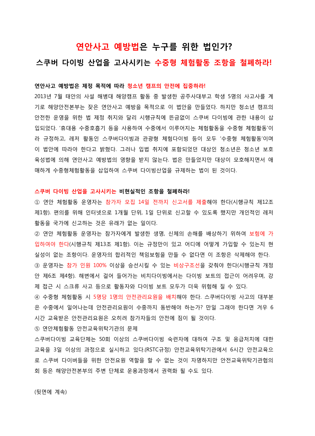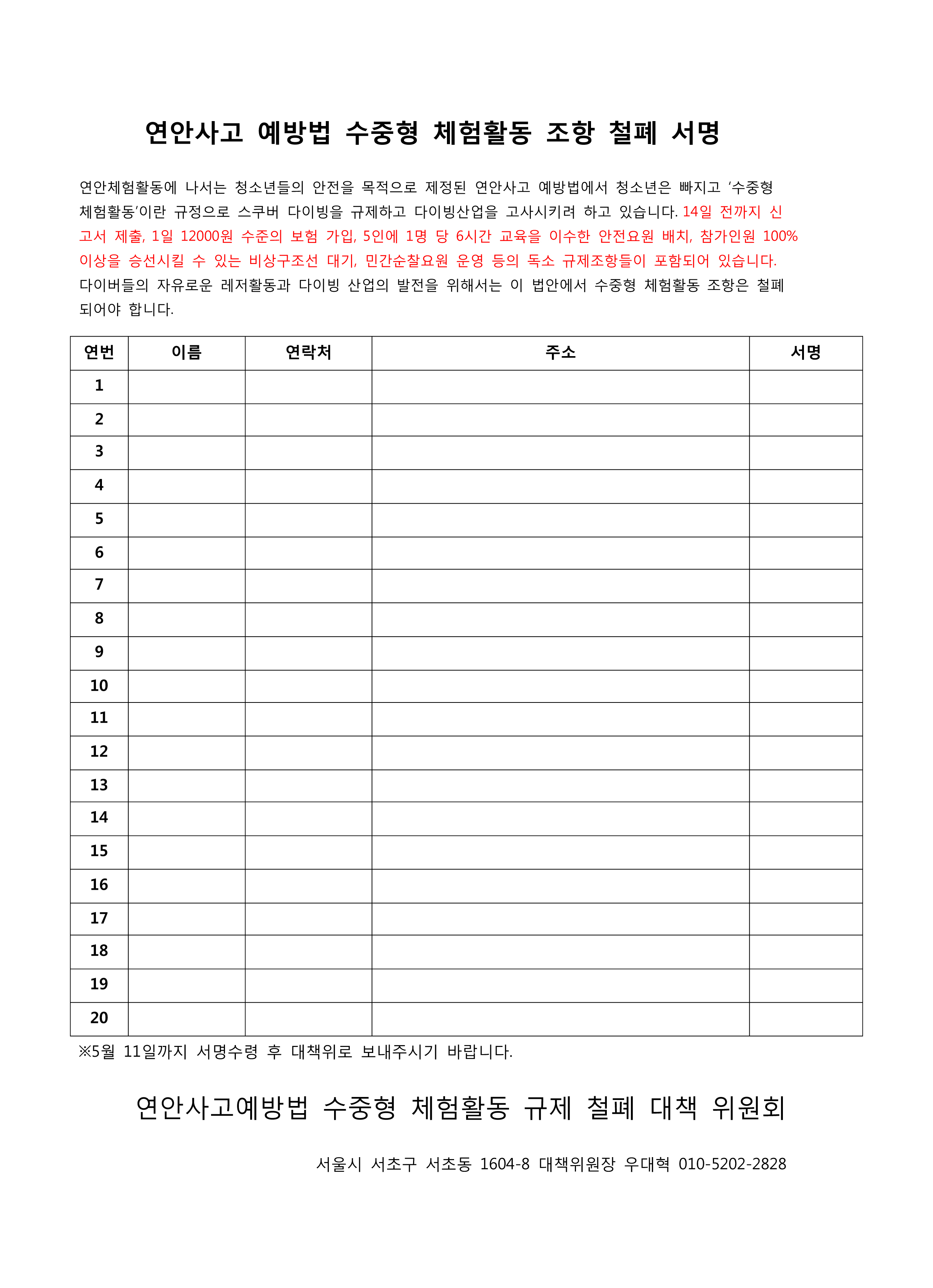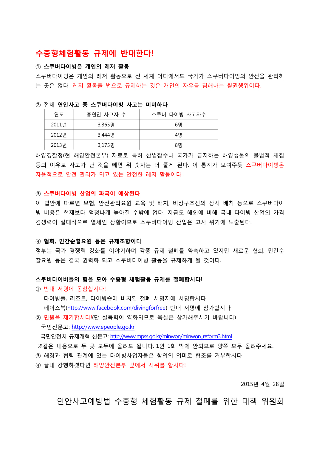 대책위원회에서 발행한 유인물 “연안사고예방법은 누구를 위한 법인가?”와 규제철폐 서명용지를 첨부한다. 서명용지를 프린트하여 대책위원회로 보내준다면 연안사고예방법 수중형 체험활동 규제 철폐를 위한 활동에 많은 힘이 되어 줄 것이다. 많은 다이버들의 적극적인 동참을 바란다.