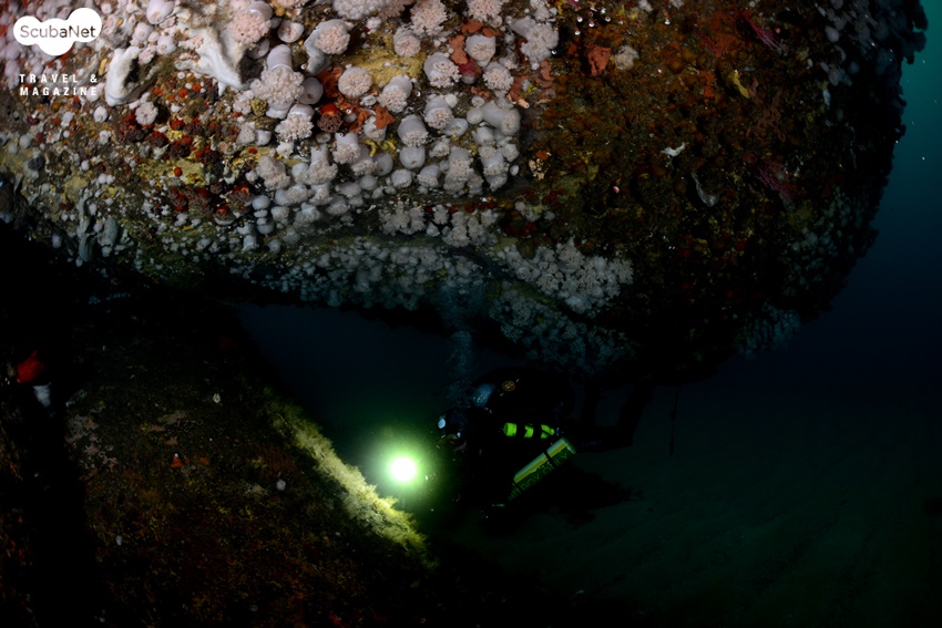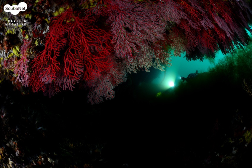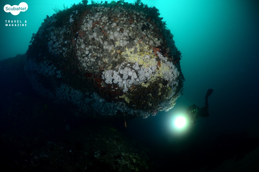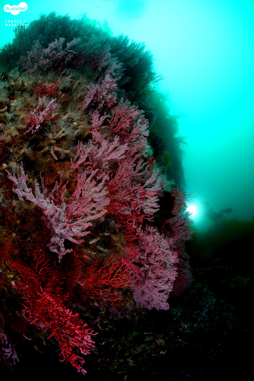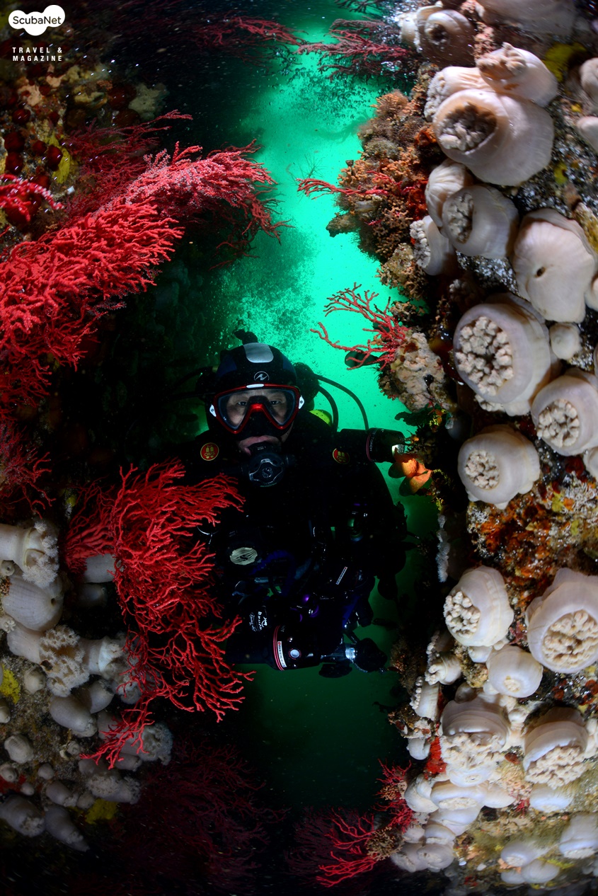 이번 취재를 통해 산호공원 포인트 다이빙을 2회에 걸쳐 진행했다. 이성호 트레이너가 가이드를 하며 모델까지 해주어 수중의 중요 포토 지점을 찾아 다이빙을 할 수 있었다. 최대 수심 35m의 암반 시작 지점에는 흔들바위처럼 혹은 괴물의 머리처럼 툭 튀어나온 바위가 있는데 그 아래로 흰색의 섬유세닐말미잘들이 군락을 이루고 있었다. 그 위용이 대단하여 셔터를 누르는 동안에도 심장이 두근거림을 느낄 수 있었다. 하지만 수심도 깊고 수온도 3℃로 낮아서 드라이슈트를 입었지만 드라이 장갑이 아니라 손이 점차 마비되고 있었다. 싱글 탱크로 다이빙하기에 깊은 수심이라 얼른 방향을 잡고 다른 포인트로 상승했다.