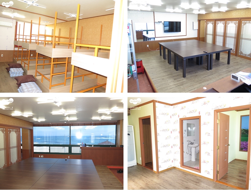 그외 리조트 바로 옆 원룸으로 최대 10명이 사용 가능한 청간정 파라다이스, 걸어서 5분 거리에 있는 2층 건물 민박집 그리고 다이버들에게 가장 인기가 있는 카라반 등이 있다. 카라반은 리조트 주차장에 위치하고 있으며 샤워부스와 주방설비 그리고 2층 침대가 있어서 4인~6인이 함께 사용할 수 있다. 자체 냉난방이 되고 바로 앞에 테이블과 소파를 별도로 놓아두어 캠핑의 분위기를 느낄 수 있게 해주고 있다.