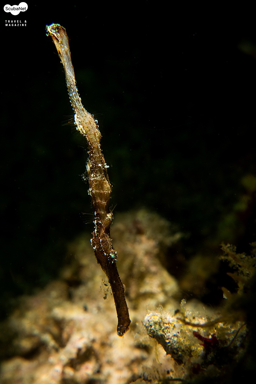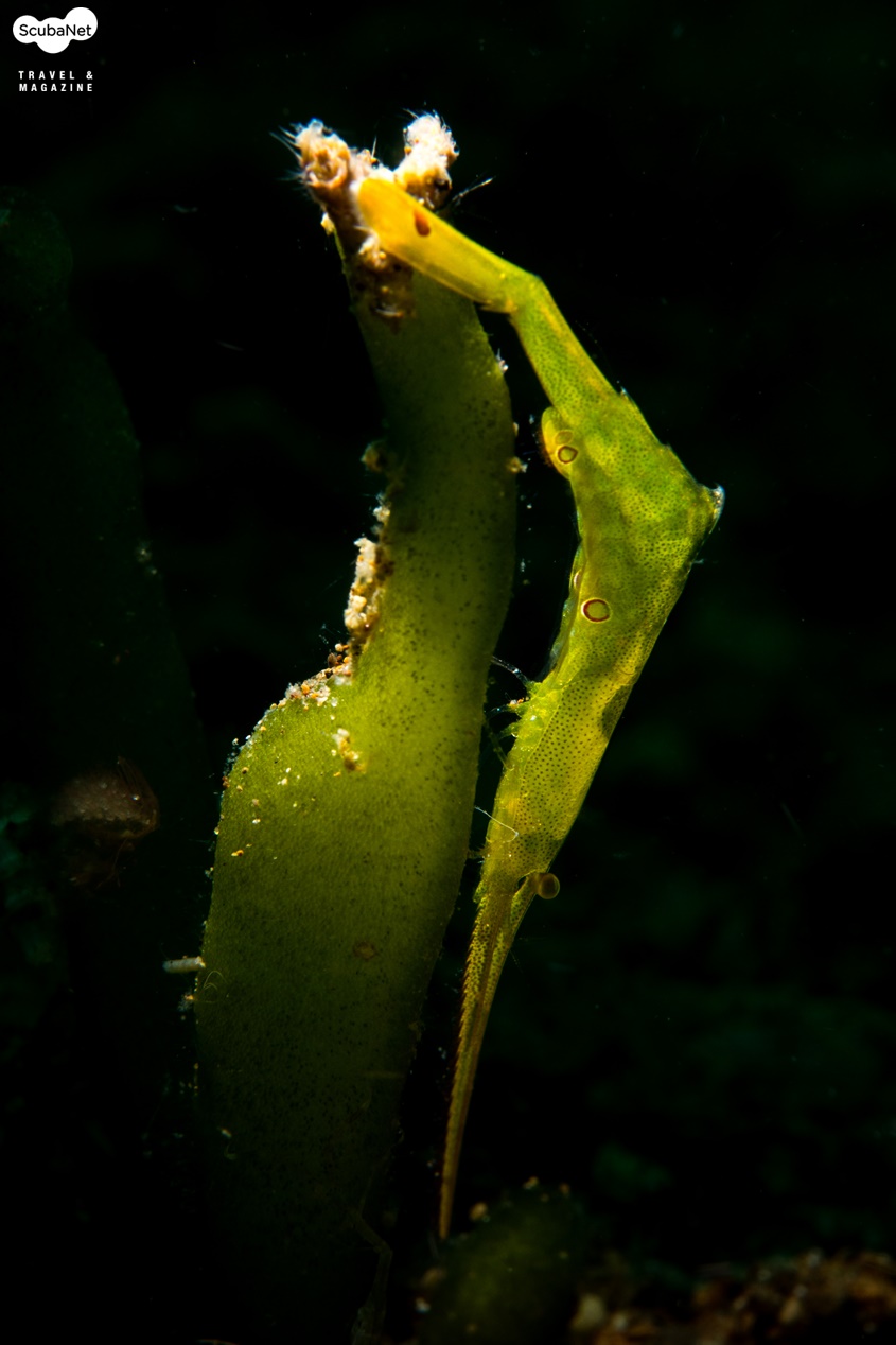 산호초 구석에서 먹이활동을 하고 있는 파이프피시를스눗을 이용하여 복잡한 배경을 어둡게 촬영하였다. 바로 위에서 빛을 조사하여 무대 위의 배우처럼 표현하고자 하였다.