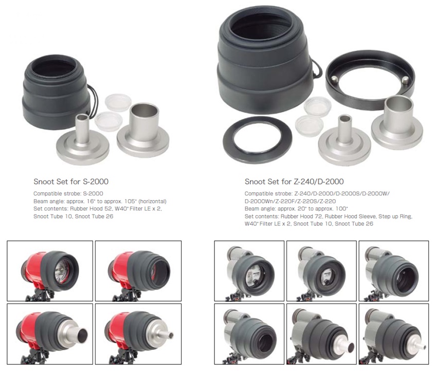 스눗의 종류는 깔때기형, 렌즈형과 광케이블형이 있지만, 가격이 고가인 렌즈형은 잘 사용되지 않고 있습니다. 깔대기형 스눗은 조사범위를 좁히는 방식으로 구멍의 크기로 다양한 연출이가능합니다. 단계별로 유니트를 분리하여 사용할 수 있지만 수중에서 조절하기는 쉽지가 않으며, 조사 범위를 좁히면서 조도의 손실이 있습니다. 스트로브를 움직여 조사방향과 거리를 조절하여야 하기 때문에 혼자 촬영하기는 번거로울 수 있습니다. 스눗을 사용하면 효과적입니다.