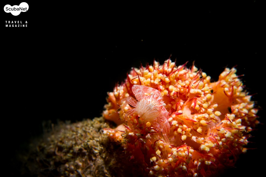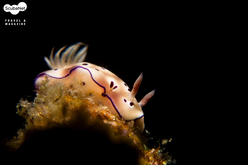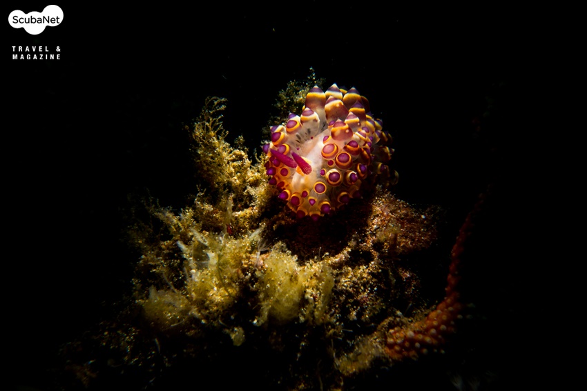 산호초 바닥을 기어다니는 갯민숭달팽이가 바위의 돌출부분으로 올라가기를 기다려 상향앵글로 촬영한 사진. 스눗으로 조광하여