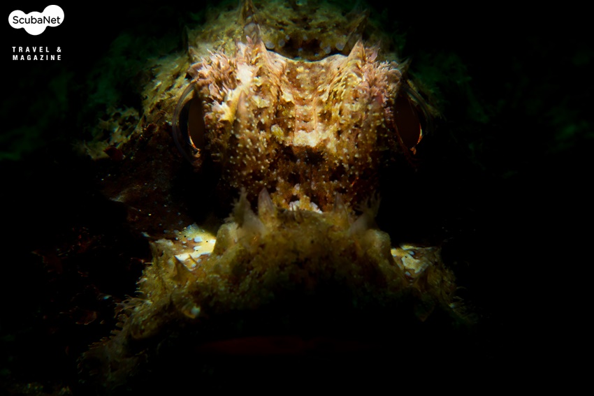 산호초에 자리잡고 있는 스콜피온피시를 스눗으로 부분조광하여 촬영한 사진. 눈과 입 부분을 최소한의 형태만 표현하기 위하여 조광을 다양한 각도와 위치로 조절하면서 촬영하였다.