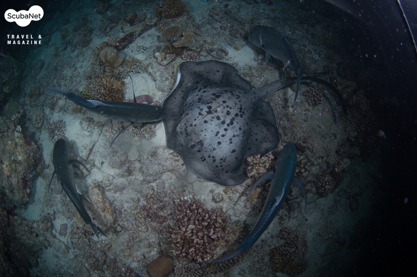 페스두 라군: 아쉬움이 남는 만타 스노클링몰디브 야간 다이빙 중에서도 백미로 꼽히는 야간 만타 다이빙. 배 뒤에 서치 라이트를 켜 두면 불빛을 보고 플랑크톤이 모여든다. 그리고 플랑크톤을 먹이로 하는 만타가 모인다. 만타가 입을 벌리고 수면까지 오르며 안정적으로 먹이 활동을 하면 다이버들은 옆으로 조심스레 내려가 수심 6~8m의 바닥에 무릎을 꿇고 앉아 랜턴을 비추고 만타의 먹이 활동을 구경할 수 있다. 단 만타가 나와줘야 하고 만타가 도망가지 않게 조심해서 행동해야 한다.