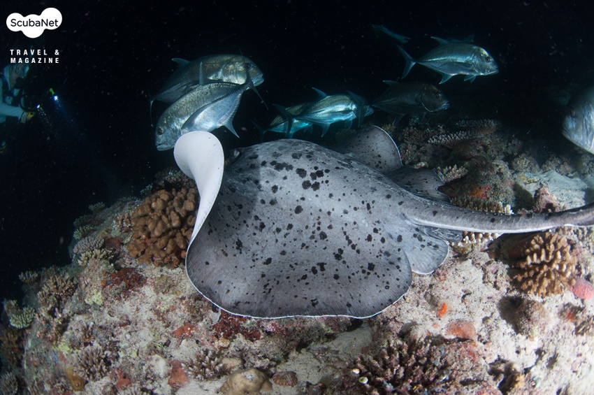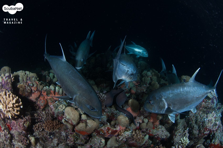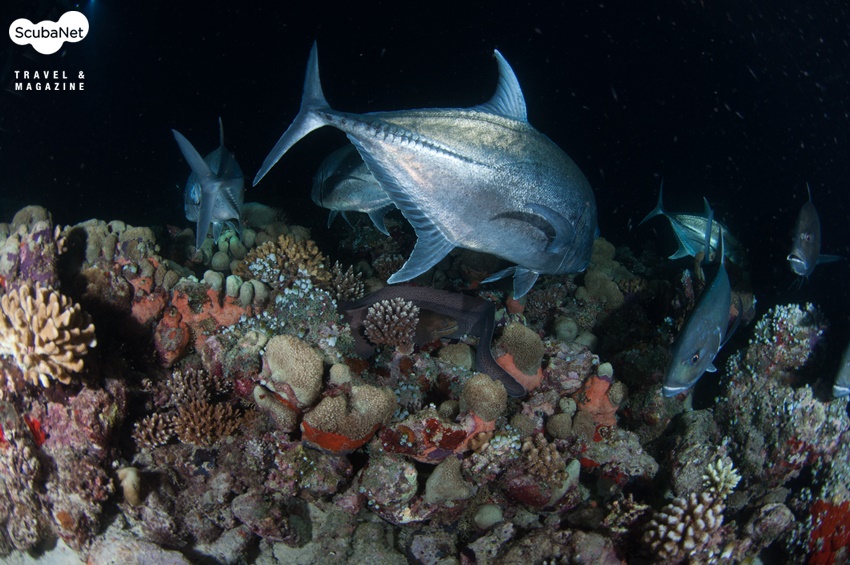 Maaya Thila 야간 다이빙 중에, 마블레이와 자이언트 트레발리의 활발한 먹이활동을 볼 수 있다