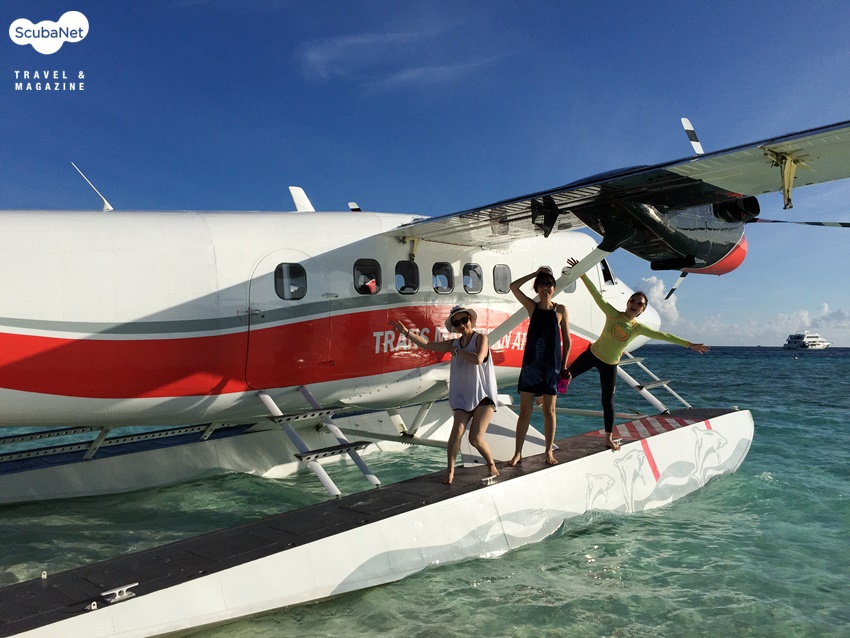 무인도에서 보내는 즐거운 오후와 바베큐 파티, Rhadigga Island저녁에 Rhadigga 섬에서 바비큐 파티를 하기로 한 날이었다. 부지런히 3회 다이빙을 마치고 나니 오후 4시. 스태프들이 바비큐 파티 준비를 하는 동안 우리는 Rhadigga 섬에 상륙해 즐거운 오후 시간을 보낼 수 있었다. 먼저 리브어보드에서 라디가 섬으로 가는 길은 도니보다 더 작은, "택시"라 불리는 보트를 타고 갔지만 몇 몇은 두 대의 카약으로 섬을 향하기도 했다. 마침 "트랜스 몰디비안 에어웨이"의 경비행기가 라디가 섬에 착륙하여 작고 귀여운 수상 경비행기의 모습을 가까이에서 볼 수 있었다.