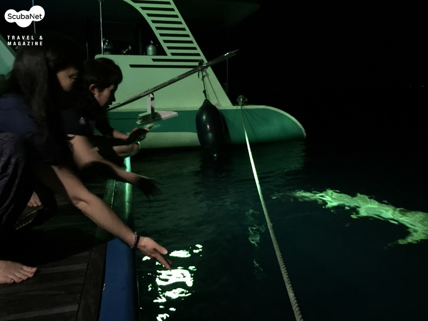 배 위에서 비추는 빛이 몽환적인 분위를 만든다.만타가 안정적으로 먹이 활동을 하길 기다렸다가 조심스레 스노클링을 하기 위해 물에 들어갔지만 이 만타는 수줍음이 많은지 조심성이 많은지 쉽게 수면 위로 올라오지 않고 자꾸 아래로 내려가 사람들의 애간장을 태웠다.