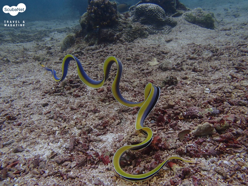 사실 RIBBON EEL을 이 곳 ANGOL 포인트에서는 자주 볼 수 있긴 합니다만 이렇게 RIBBON EEL의 몸 전체를 보는 건 특별한 경우입니다. 경계심이 많은 RIBBON EEL의 경우 늘 조그만 구멍에서 몸의 상체 일부분만 내밀고 있는 게 일반적인 경우입니다. 이런 RIBBON EEL이 구멍 밖으로 나와서 돌아다니는걸 보는 게 흔치 않지만 운 좋게 이런 장면이 볼 수 있는 포인트가 바로 ANGOL 입니다.