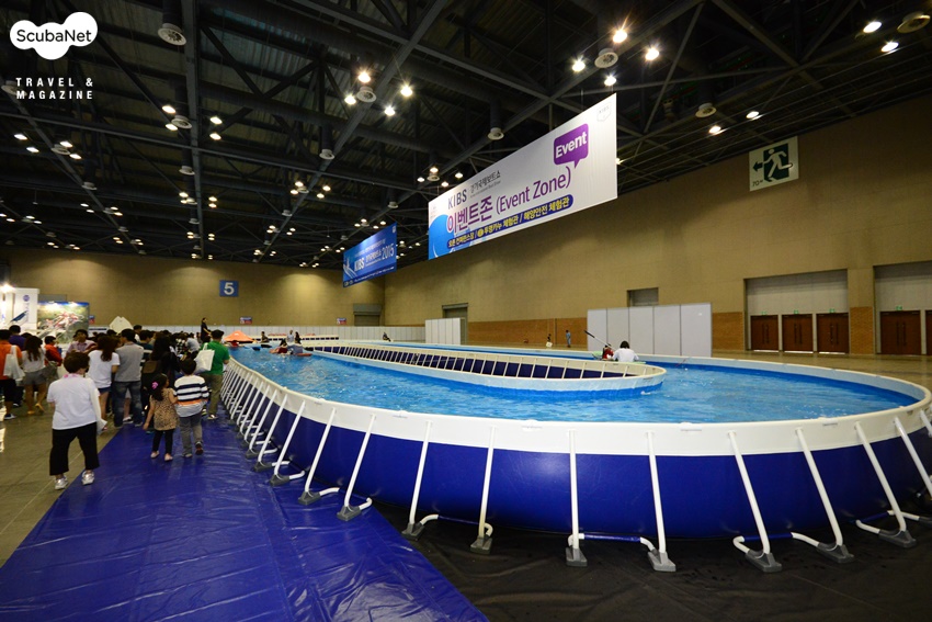 전시장에 마련된 유수풀. 프리다이빙, 카약체험, 구명보드 체험이 진행되었다.