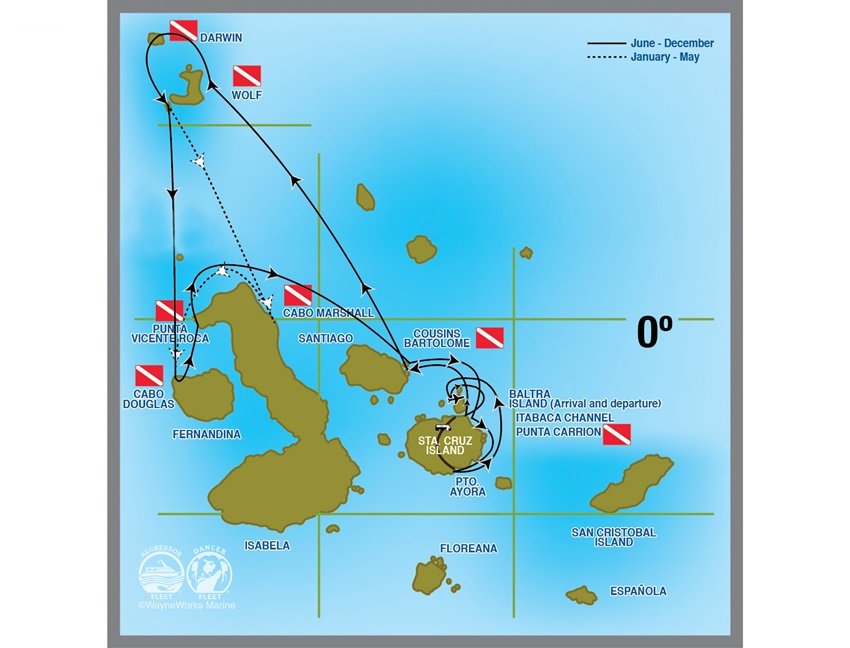 여섯째 날 아침에 페르난디나 섬의 코보 더글라스(Coba Douglas)에 도착하여 오전에 2회 다이빙을 하고, 다시 이동하여 이사벨라 섬의 푼타비센트로카(Punta Vicente Roca)에서 오후에 2회 다이빙을 한다. 밤 사이에 항해를 해서 일곱째 날 아침에 다시 산티아고 섬의 커슨스락(Cousins Rock)에서 마지막 다이빙을 하고, 다시 항해를 하여 아요라(Ayora) 항에 오후에 도착해 산타크루즈 섬의 하이랜드 관광과 저녁 파티를 즐기며 여정을 마무리 한다. 배는 다시 밤 사이에 항해하여 여덟째 날 아침에 발트라 섬에 도착하여 하선하게 된다. 이 일정이 6월~12월까지 드라이시즌 갈라파고스의 전형적인 항해 루트이고, 1월~5월의 웜시즌에는 개복치를 볼 수 있는 푼타비센트로카 대신에 만타를 볼 수 있는 코보 마샬(Cobo Marshall)이 항로에 포함된다.