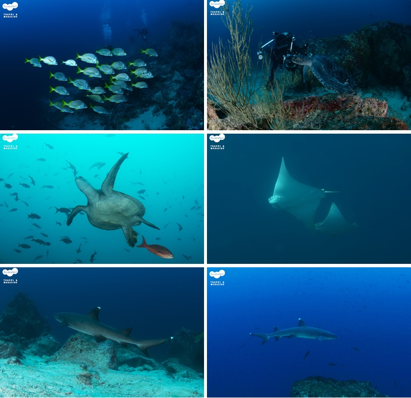 또한 고래상어가 나타나 10분 이상을 함께 유영하기도 했는데 크기가 10m 이상으로 크지는 않았지만 그래도 다이버들이 충분히 촬영할 수 있는 시간을 허락해주었다. 그 외 갈라파고스 상어와 실크상어, 화이트팁 상어들도 만날 수 있었고, 바다거북과 바다사자도 흔했다.