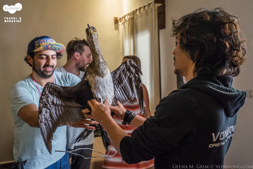 소품으로 준비된 박제가마우지를 살펴보는 Von Wong.